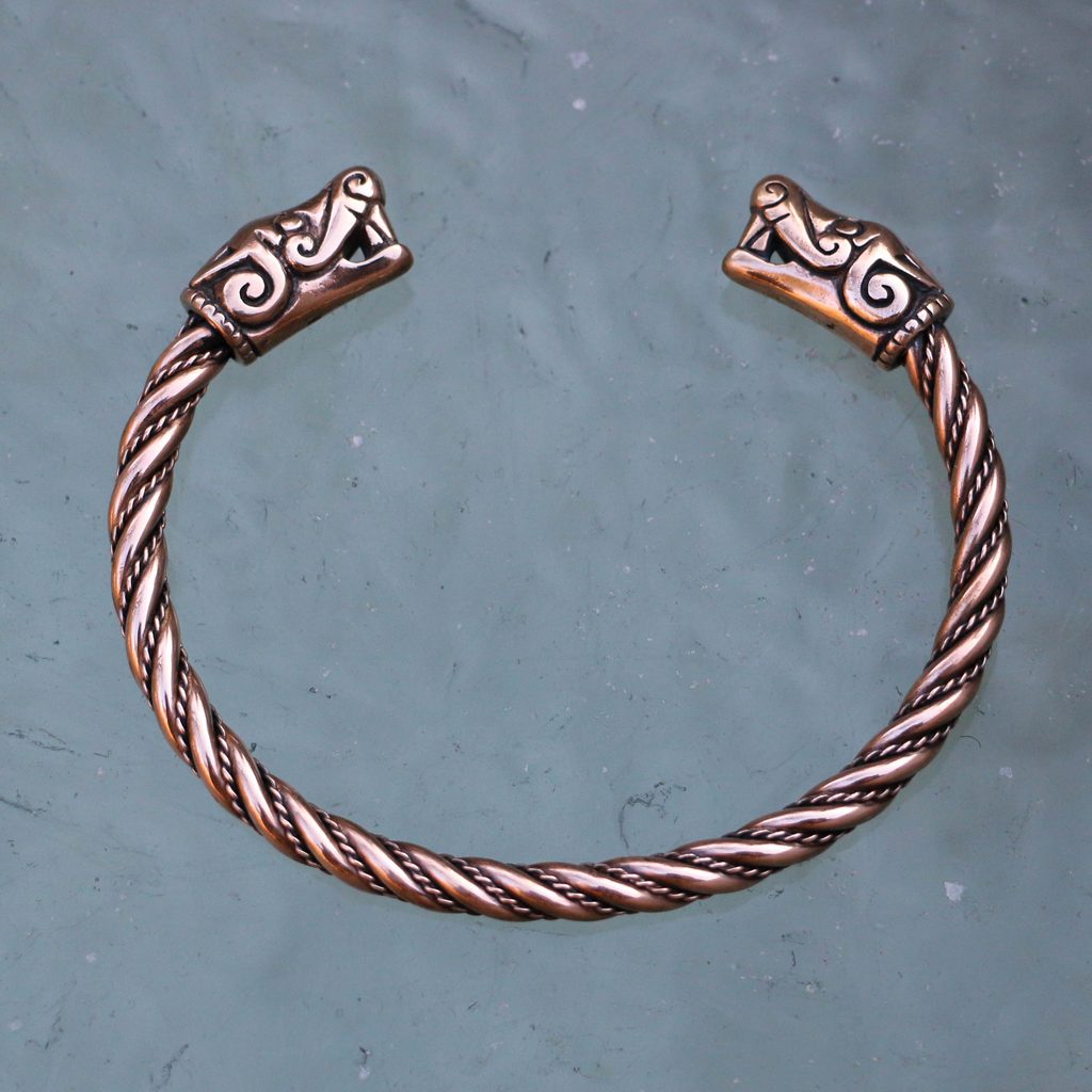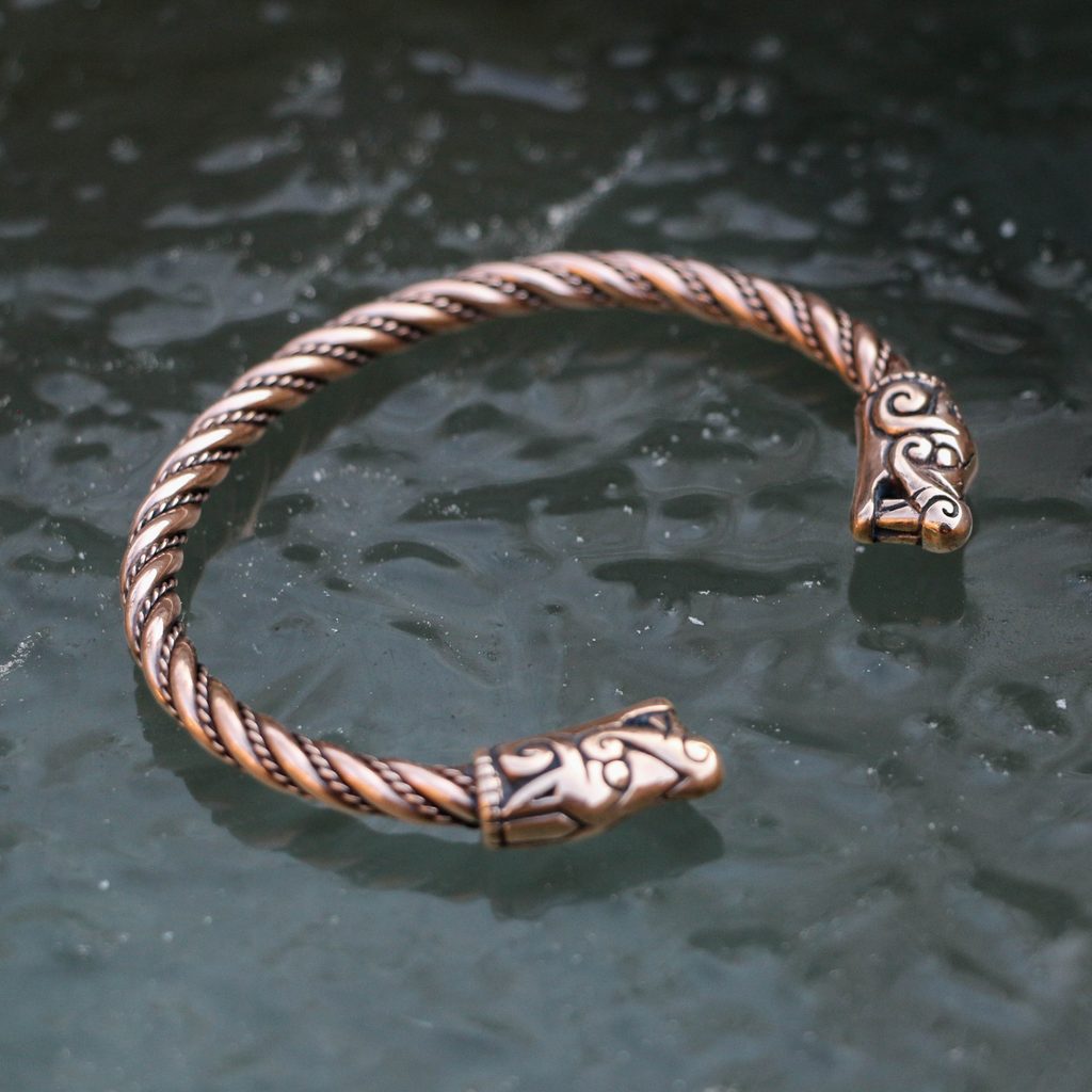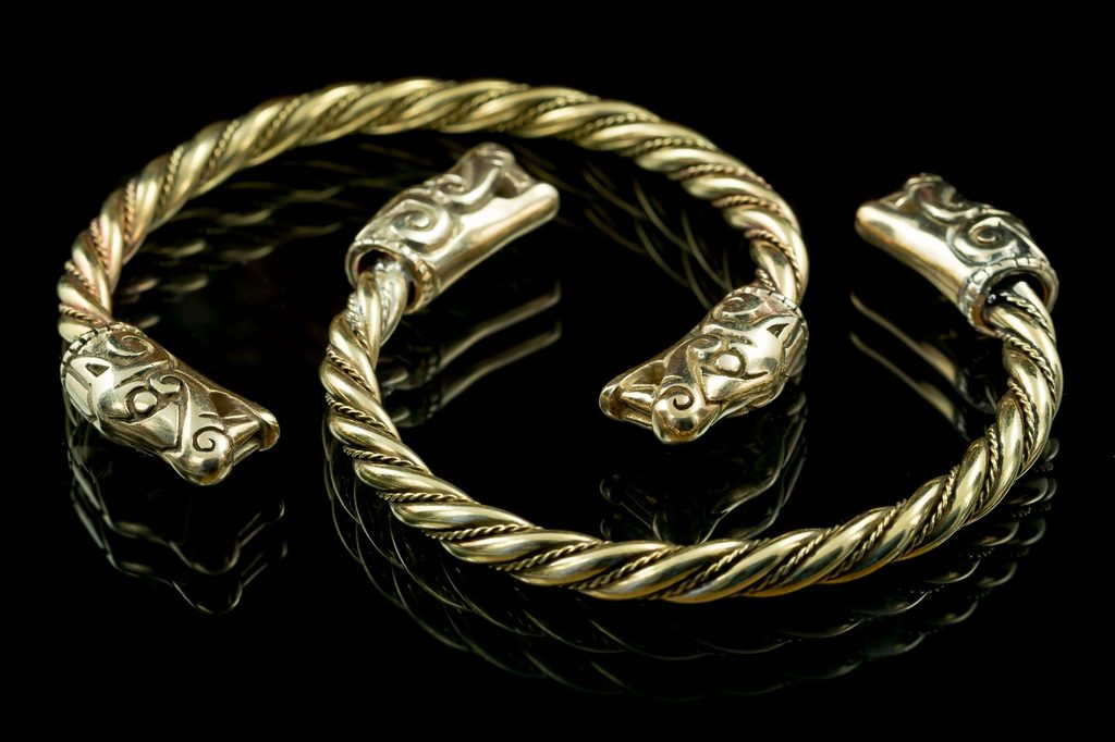 Náramek dle předlohy vikinského náramku nalezeného na ostrově Gotland (Švédsko), lokalita Burg. Model pro náramek byl vyroben spletením prutů různé šíře, zakončeno stylizovanými vlčími či snad dračími hlavami. To vše jsme nechali odlít do bronzu. Při objednávce je důležité uvést obvod zápěstí, náramek Vám bude dodán ve velikosti, kdy půjde lehce nasadit i sundat, aby nebylo třeba kov ohýbat, což by mohlo způsobit jeho prasknutí. V případě potřeby úpravy velikosti náramku je nutné jej ohýbat pouze u hlav na jeho konci.