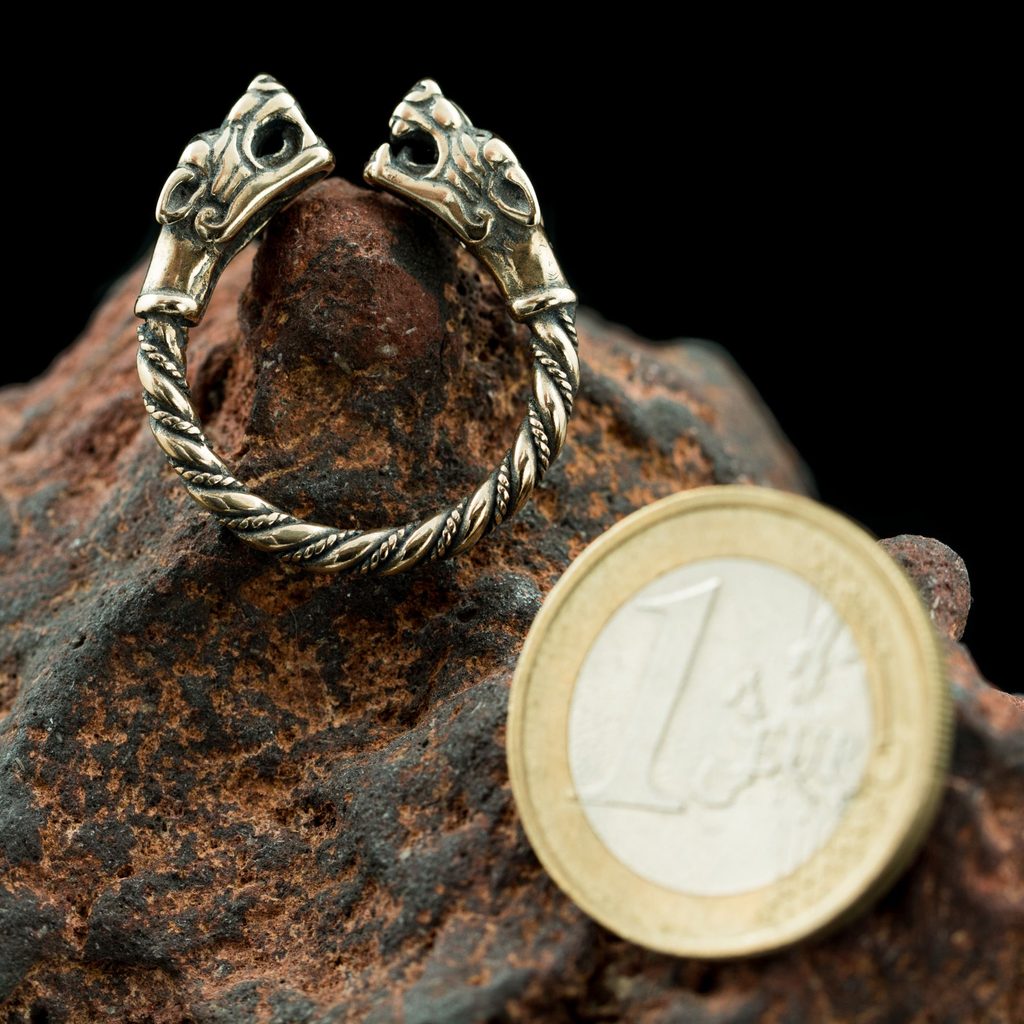 Vyrobený z bronzu s patinovaným povrchem, který zvýrazňuje detaily propletených vlčích hlav. Prsten je otevřený a mírně nastavitelný, takže se přizpůsobí většině velikostí. Skvěle doplní historický kostým, ale i moderní styl s dotekem severské mytologie.