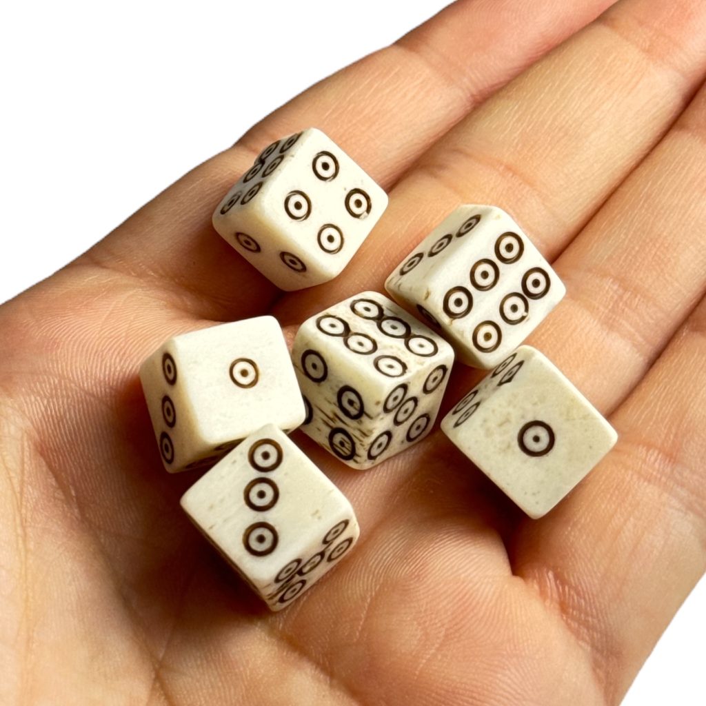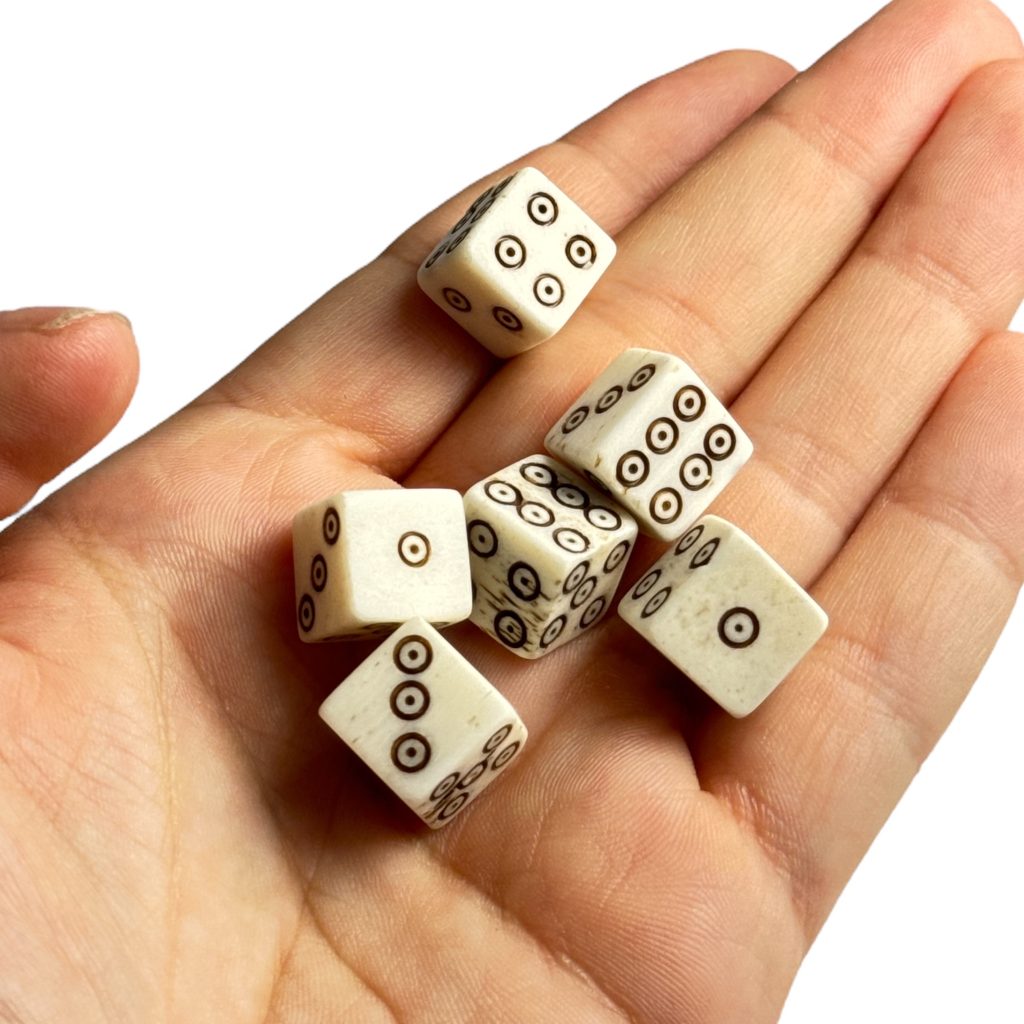 Originální dárek - ručně vyřezávané hrací kostky v kalíšku z kůže. Výška hracího kalíšku cca 9,5 cm, velikost kostek cca 10 mm. Vyrobeno v ČR.