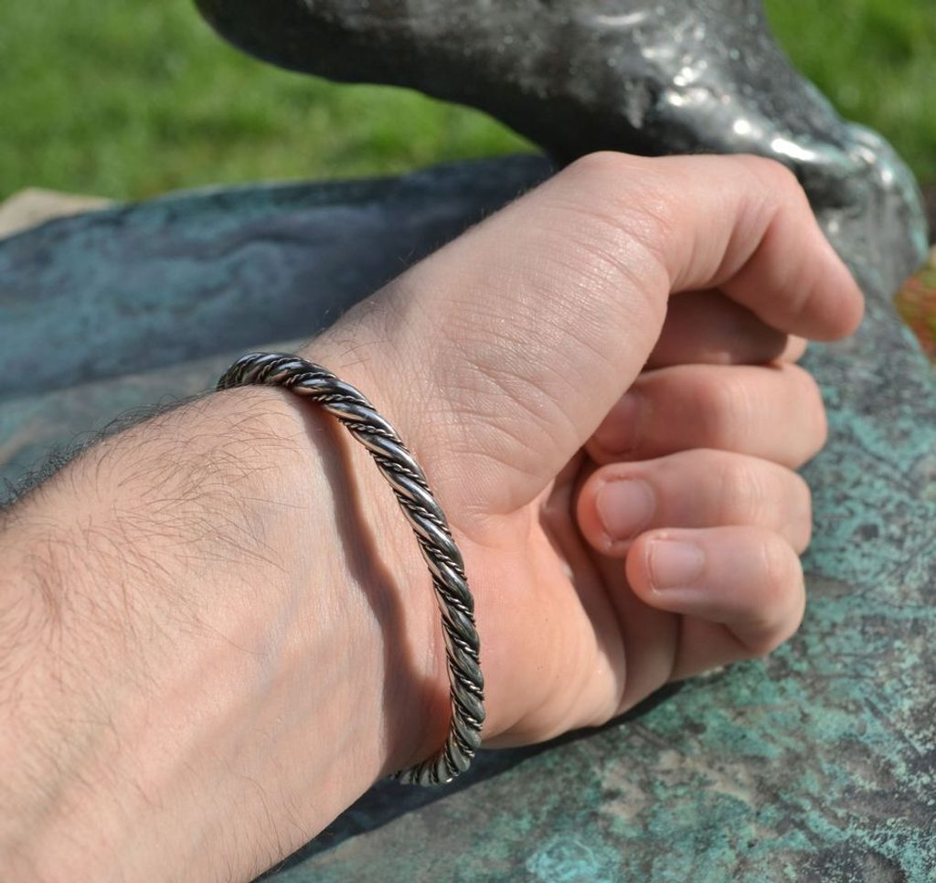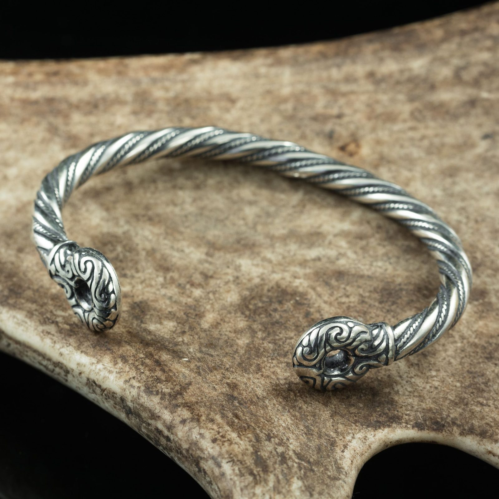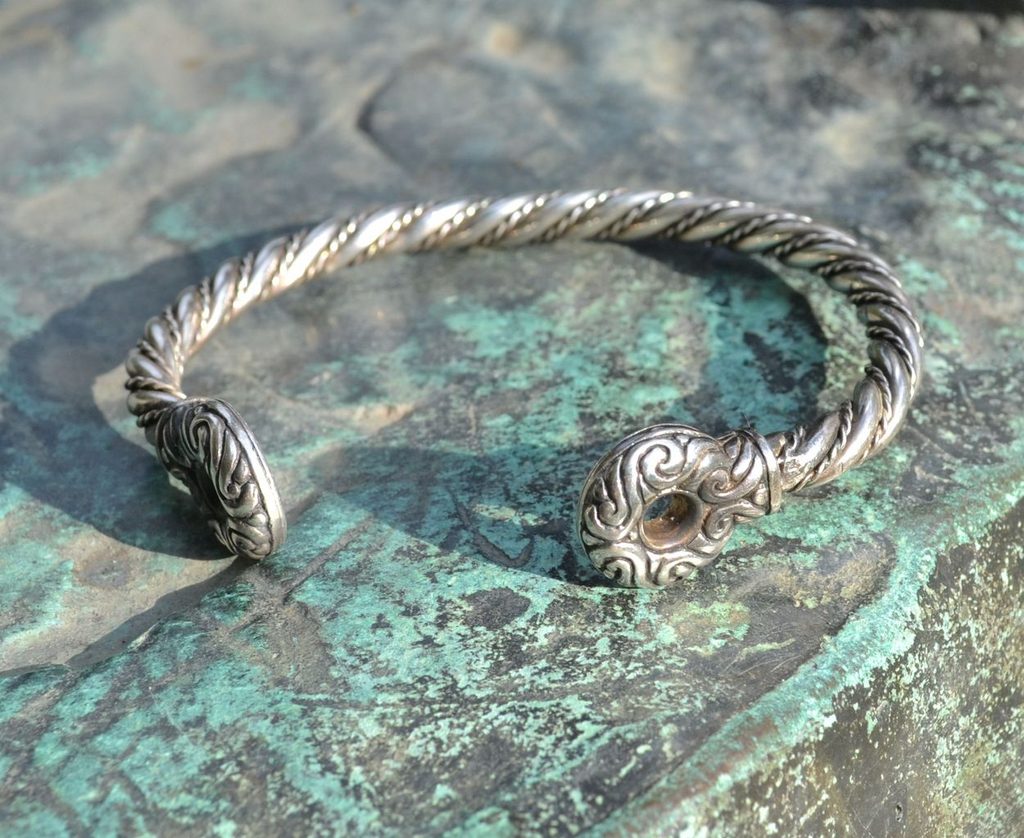 Stříbrný pečetítkový náramek, který tvarově vychází z keltských torquesů (nákrčníků králů, hrdinů a druidů). Náramek je vyroben ze stočených stříbrných prutů, což zajišťujě jeho dobrou pružnost a tím i nastavitelnost obvodu.