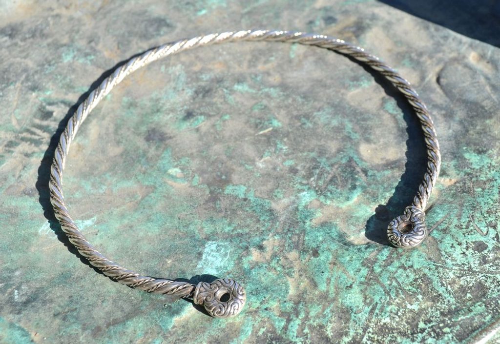 Stříbrný pečetítkový torques. Torques je vyroben ze stočených stříbrných prutů, což zajišťujě jeho dobrou pružnost a tím i nastavitelnost obvodu. Torques je latinský výraz pro nákrčník, společné pojmenování pro všechny pevné náhrdelníky v podobě kovových kruhů nošených na krku. Je znám od doby bronzové, v oblibě jej měli Římané a dále je považován za typický keltský artefakt. Tento šperk byl náboženským i světským odznakem moci, uctívání a ochrany, nosili jej bohové a bohyně, hrdinové, válečníci, kněžny a knížata; byl známkou vysokého společenského postavení a šperkem význačných žen.
