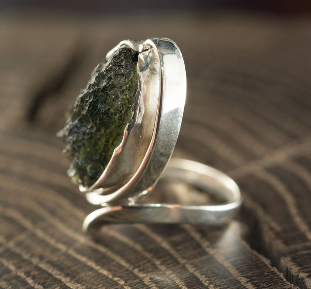Surový jihočeský vltavín zasazený ve stříbře. Každý prsten je originál, Váš šperk bude mít odobný styl i velikost jako ten vyobrazený. Na Vaši žádost Vám před odesláním pošleme fotku našich skladových kusů.