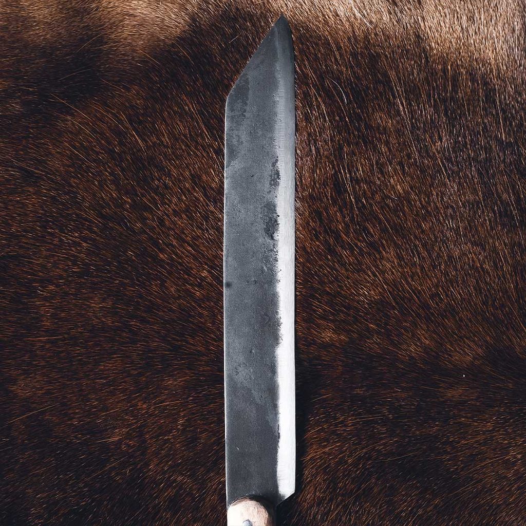 Ručně kovaný Vikinský sekáč, který byl zhotoven podle nálezu z Velké Británie. My jsme ho ještě doplnili dřevěnou rukojetí a pronýtovali. Ocení ho určitě nejen příznivci severské historie, ale i zálesáci. Je ostrý a díky svému tvaru dost pádný (vhodný k sekání větví, řezání masa apod. Přirovnali bychom ho k medvědímu drápu. Z obrázku to není patrné, že tento saex má tvar klínu.