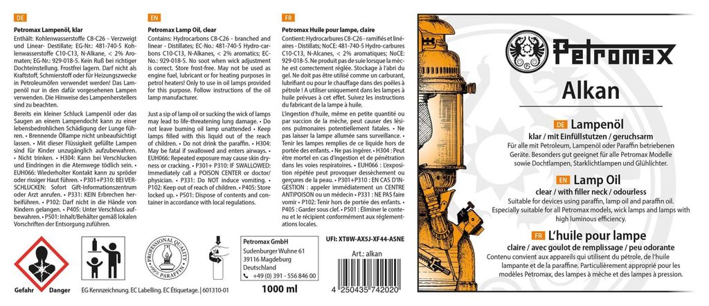 Petromax Alkan Paraffin Alkan je transparentní, čistý olej do lampy bez zápachu pro vaši lampu Petromax. Je také ideálně vhodný pro jiné petrolejové nebo olejové lampy a kamna.