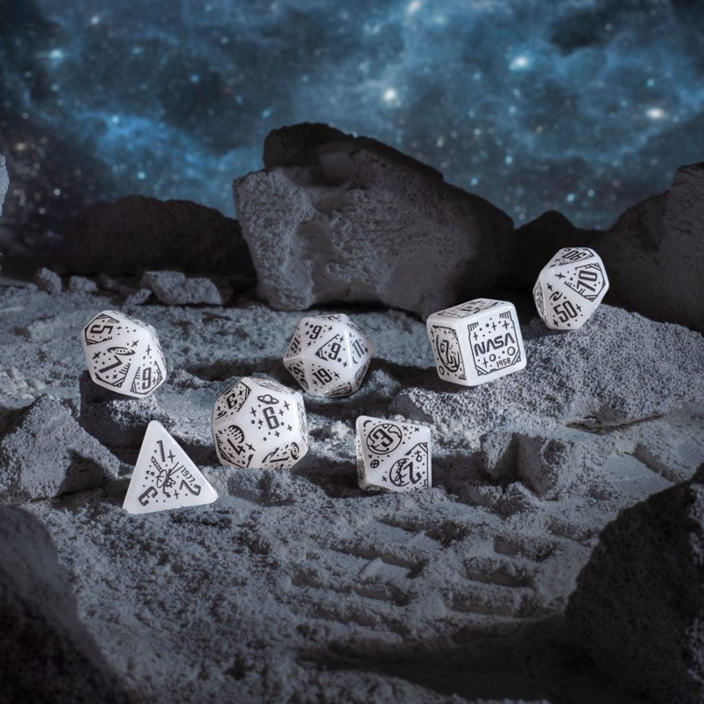 Vesmír čeká na další objevování! Tato sada vzdává hold průlomovým událostem ve zkoumání vesmíru a vezme tě na cestu plnou neuvěřitelných objevů a úspěchů. Každá ze sedmi kostek je pečlivě zpracovaná – bílý základ je obohacen třpytivým prachem a černými detaily, připomínajícími pohled na Mléčnou dráhu skrze čočku teleskopu.