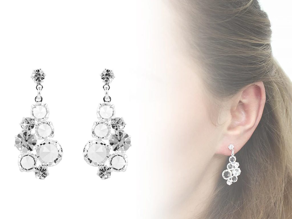 Elegantní visací náušnice jsou ozdobené broušenými kamínky. Každá žena je ocení na speciální příležitosti, jsou nepřehlédnutelné. Skleněné broušené kamínky prvotřídní české kvality jsou pevně zasazené do kovového lůžka. Na slunci i umělém světle se náušnice zajímavě třpytí. Kov na náušnicích má povrchovou úpravu se stříbrnou galvanizací. Náušnice jsou puzetového typu s kovovou zarážkou. Tento výrobek neobsahuje těžké kovy.