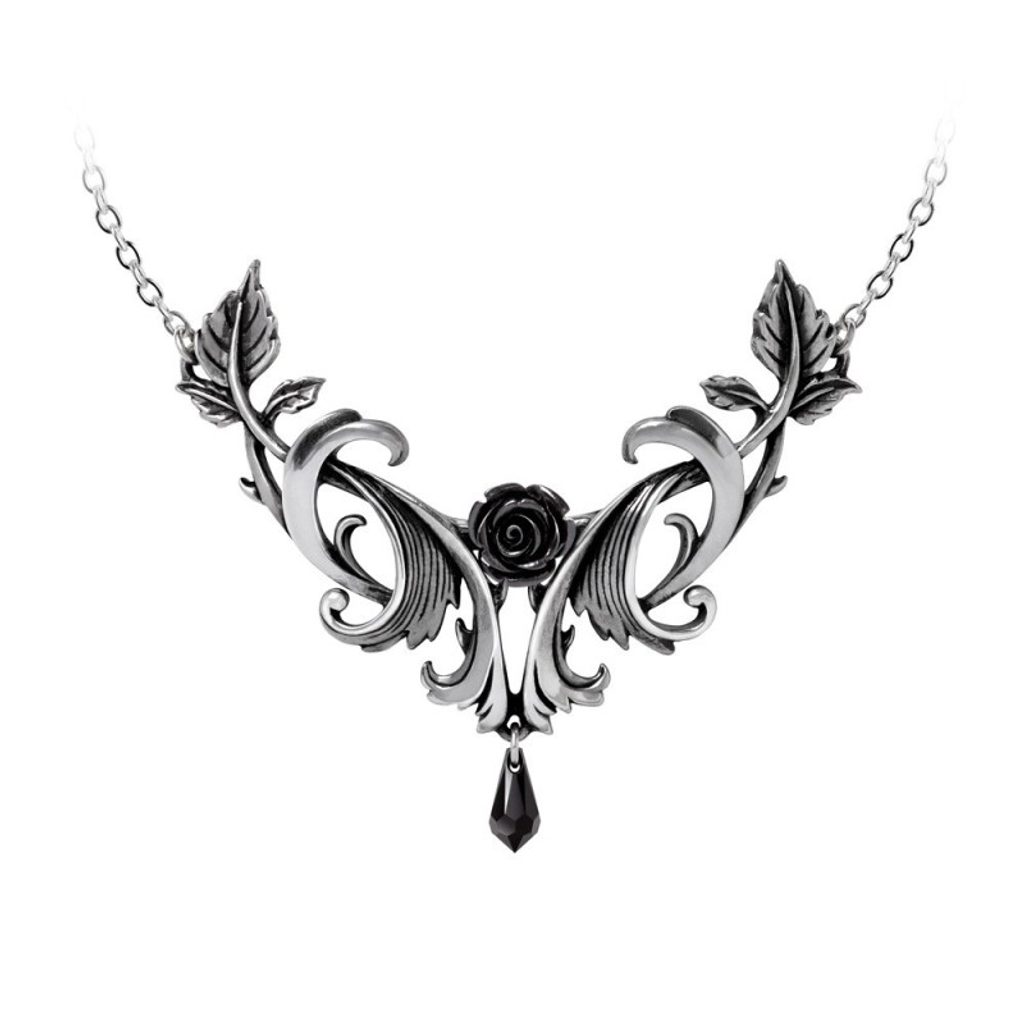 Tento jemný náhrdelník inspirovaný barokním stylem je zdoben detaily růžových výhonků a jedinou černou růží, zvýrazněnou oslnivým černým krystalem rakouské výroby.