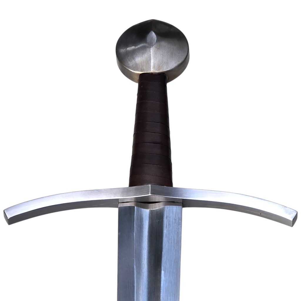 Jednoruční středověký meč z naší kovářské dílny. Konstrukčně i řemeslně velmi povedený meč v provedení full-tang. Celá čepel je vyrobena v jednom kuse, skrz hlavici meče, kde je čepel zanýtována. V tomto tupém provedení je meč určen ke scénickému šermu.