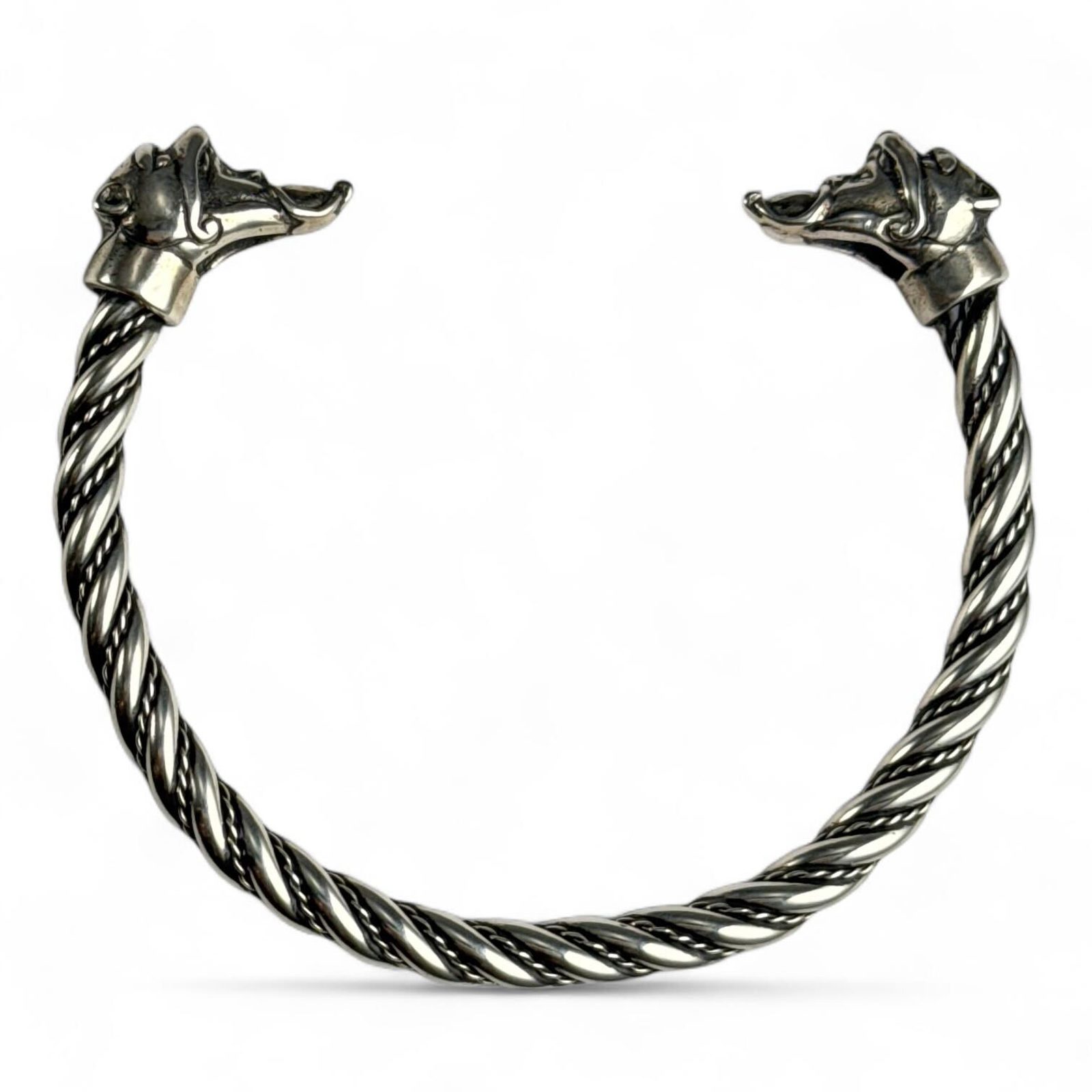 Stříbrný náramek inspirovaný berserkery, válečníky severu, kteří v bitvách propadali bojovému šílenství. Berserkeři nosili zvířecí kůže – nejčastěji medvědí – a věřilo se, že přijímají sílu a divokost těchto tvorů. Masivní zakončení náramku v podobě lidské hlavy s mědvědí kožešinou odkazuje na odvahu, sílu a nezlomného ducha válečníka.