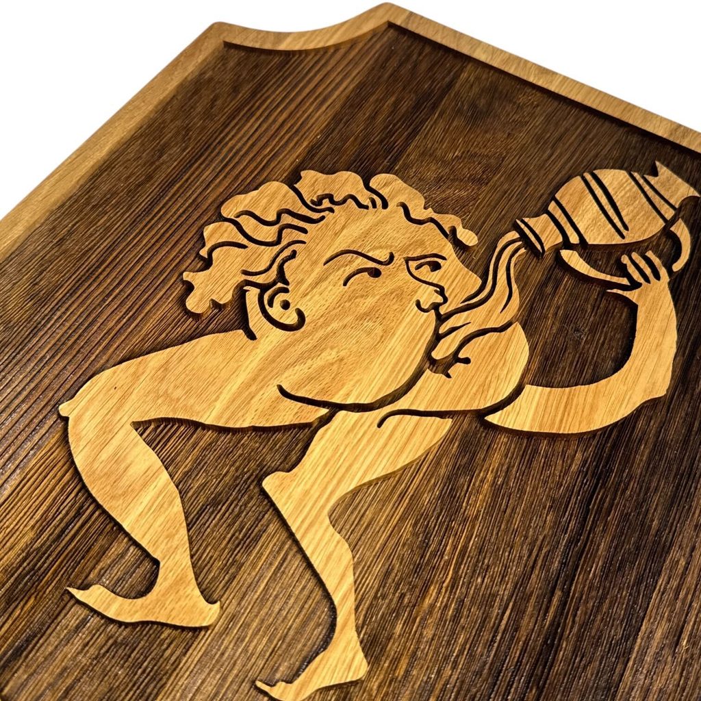 Dřevěná nástěnná ozdoba ve tvaru vývěsního štítu s logem Kingdom Come: Deliverance 2 je vyrobena z dubového dřeva. Motiv je reliéfní, dřevo je vypáleno do hloubky cca 3-4mm. Díky rozdílné tvrdosti zimních a letních dřevitých vláken je vypalováním docílena jedinečná textura, která je originálem na každém kusu. Z druhé strany je upevněn háček na zavěšení ke zdi.