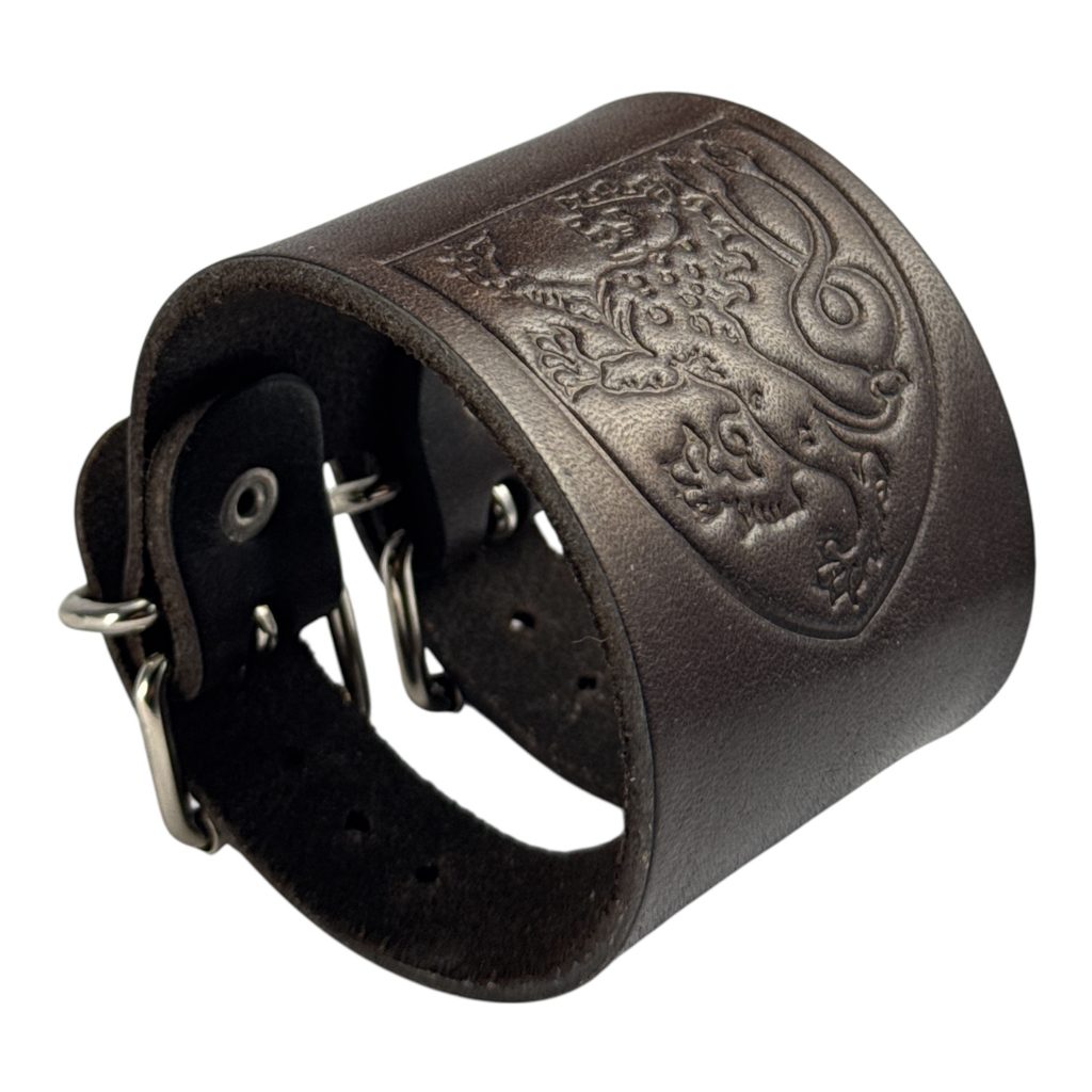 Kožený nastavitelný náramek s vyraženým motivem českého lva ve štítu.