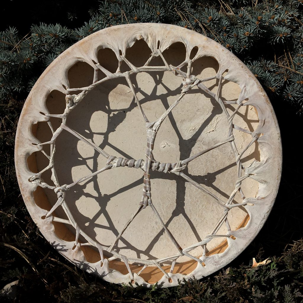 Ručně malovaný indiánský šamanský bubínek vyroben z pravé jelení kůže natažené za mokra na dřevěnou obruč. Jednoduchý, přesto velice zvučný nástroj, který Vás ve správných rukách přivede do transu. Hřmící pták na noční obloze je prostředníkem přenášejícím prosby člověka k vyšším bytostem.