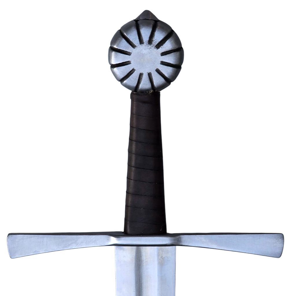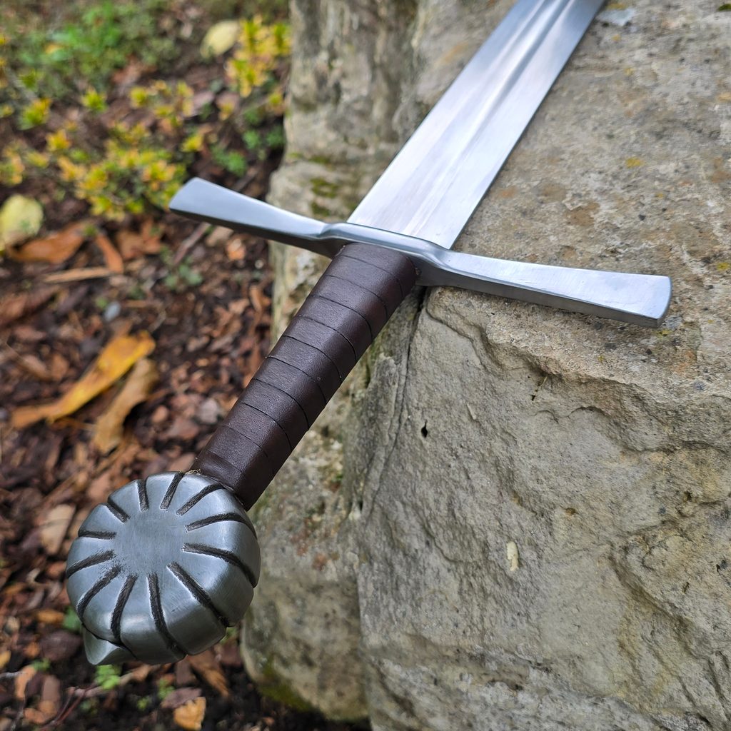 Jednoruční středověký meč z naší kovářské dílny. Konstrukčně i řemeslně velmi povedený meč v provedení full-tang. Celá čepel je vyrobena v jednom kuse, skrz hlavici meče, kde je čepel zanýtována. V tomto tupém provedení je meč určen ke scénickému šermu.
