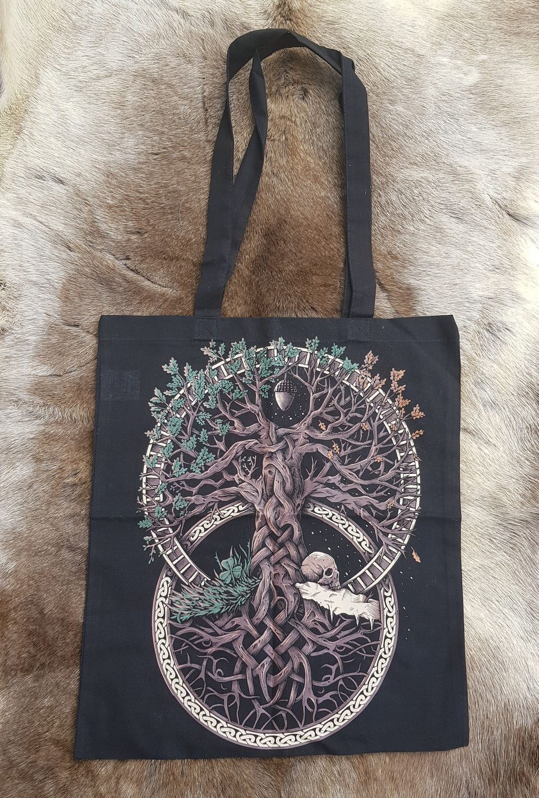 STROM ŽIVOTA, plátěná taška. Strom života a stromy obecně mají posvátný význam v mnoha světových mytologiích a náboženstvích. Lidé, pozorujíce růst a zánik stromů a každoroční růst a zánik květů a listů, viděli stromy jako mocné symboly růstu, smrti a znovuzrození. Věčně zelené jehličnaté stromy často představují symbol věčnosti a nesmrtelnosti. Mezi posvátné a symbolické stromy patří banyan (hinduismus a budhismus), strom poznání (judaismus a křesťanství) a posvátné dubové háje (germánská a keltská mytologie).