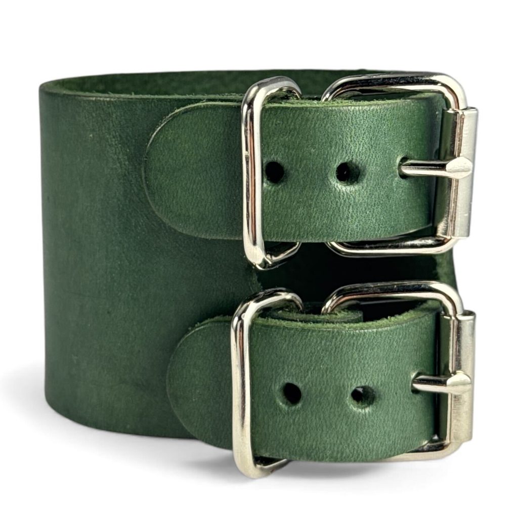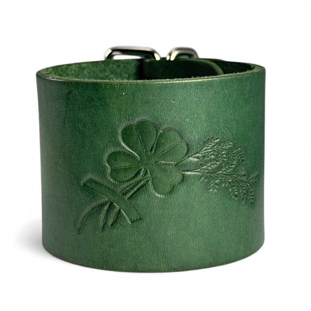 Zelený kožený náramek s čtyřlístkem je zhotoven z kvalitní hovězí kůže a barven do hlubokého smaragdového odstínu. Dominantou je reliéf čtyřlístku doplněný jemnými rostlinnými motivy, vyražený pomocí původních secesních raznic, které po sto letech opět našly uplatnění.
