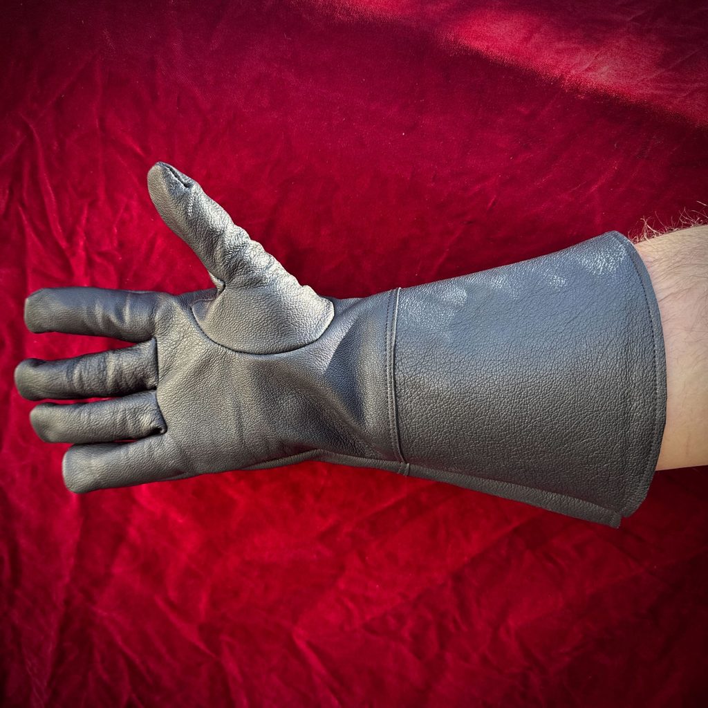 Šermířské strojně šité rukavice z koziny. Dvojitá, kontrastně podlepená manžeta délky 14cm. Rukavice jsou měkké, pohodlné a velice dobře se přizpůsobí tvaru ruky. Česká tradiční výroba.