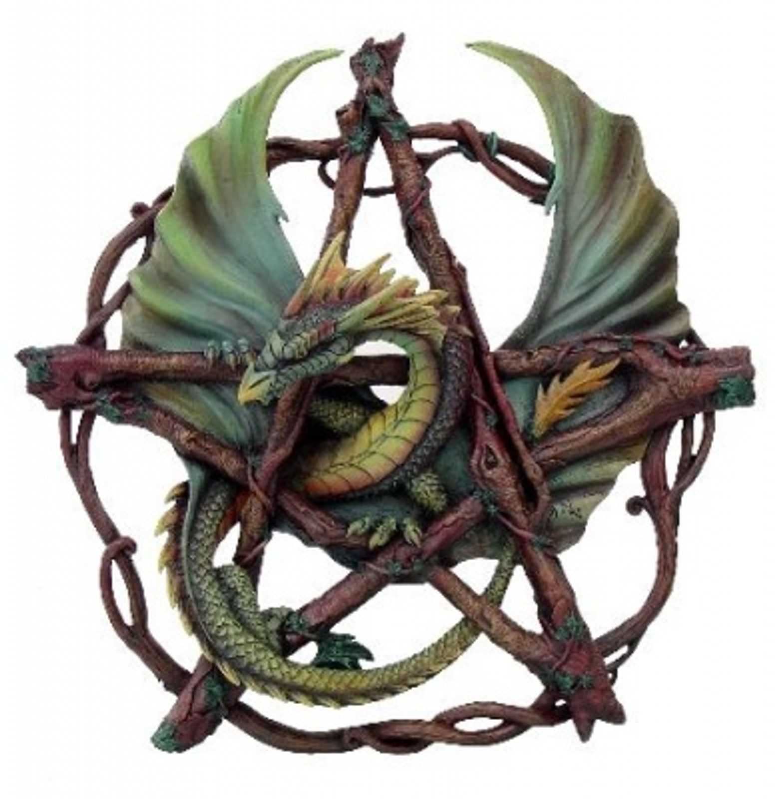 LESNÍ DRAK, pentagram, nástěnná dekorace. Velikost přibližně 32,5 cm. Výrobek je zhotoven ze tvrzené pryskyřice, ručně malováno. Dovoz z Velké Británie: Drakkaria.