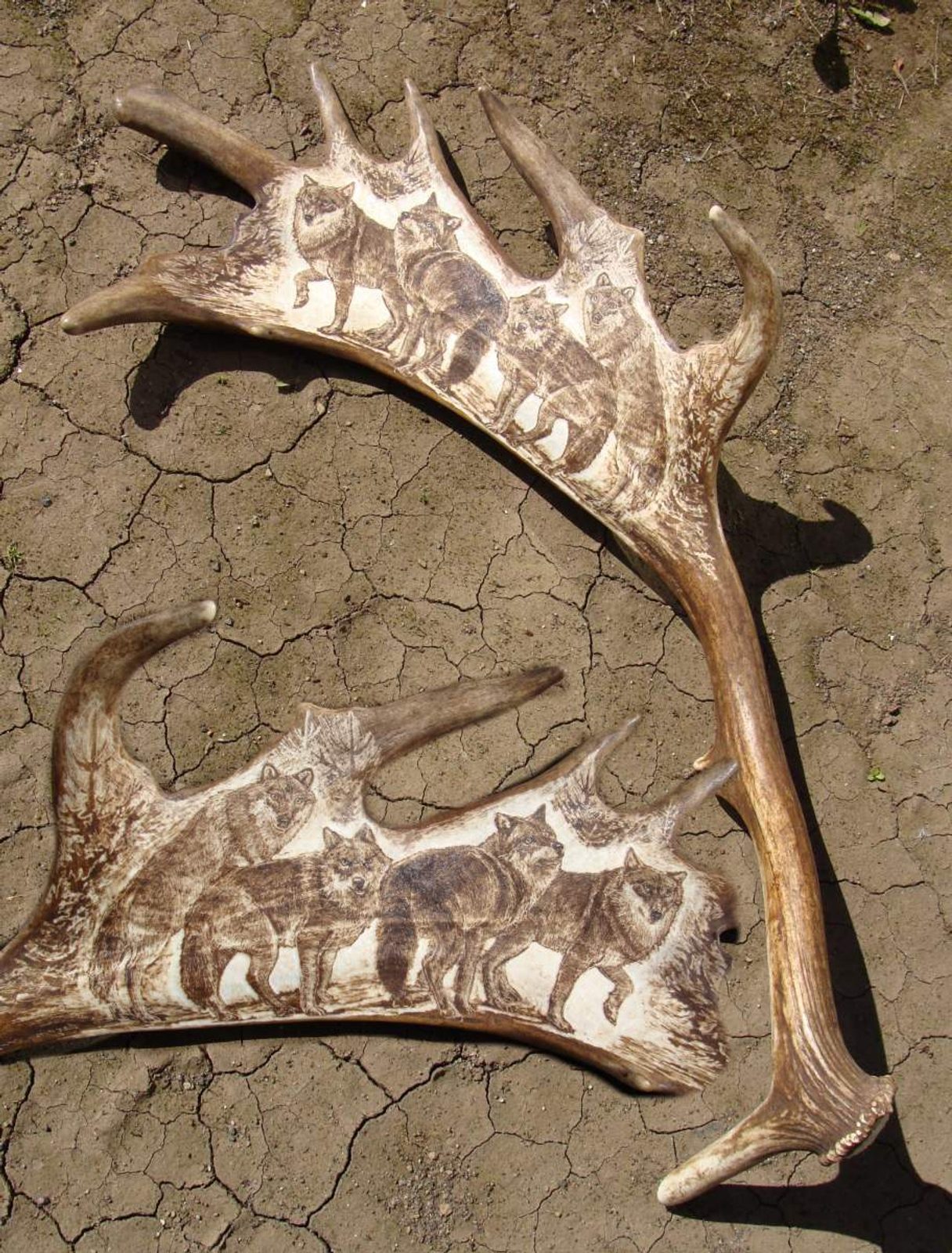 Řezba do daňčího parohu s motivem Vlčí smečka.