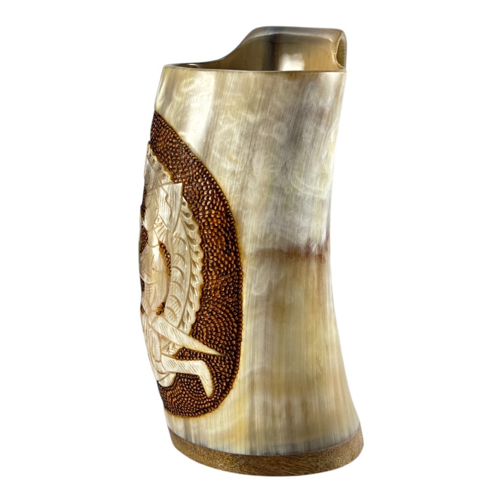 Naprosto řemeslně do nejmenšího detailu vyrytý vikingský pohár z rohoviny. Pohár má ouško. Pro dno rohu je použito dřevo. Vše pak je vylito speciálním lakem.