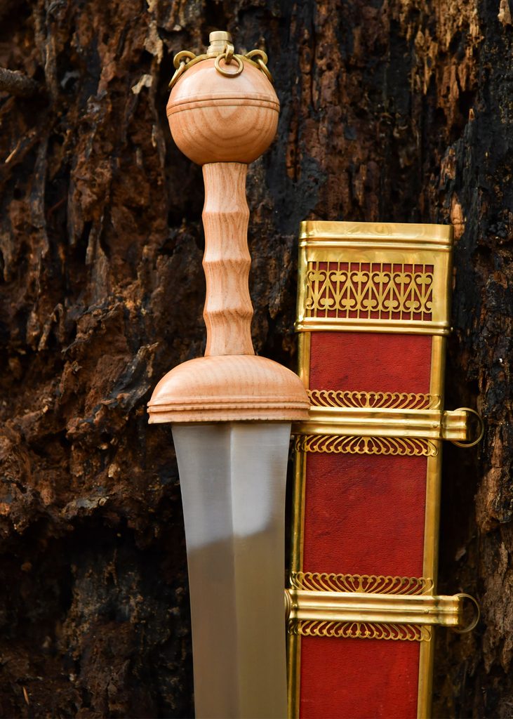 Římský krátký meč je dodáván s krásnou dřevěnou pochvou potaženou červenou kůží a doplněnou mosazným kováním. Dva horní pásy jsou opatřeny mosaznými závěsnými kroužky, které umožňují nosit gladius v autentickém římském stylu.
