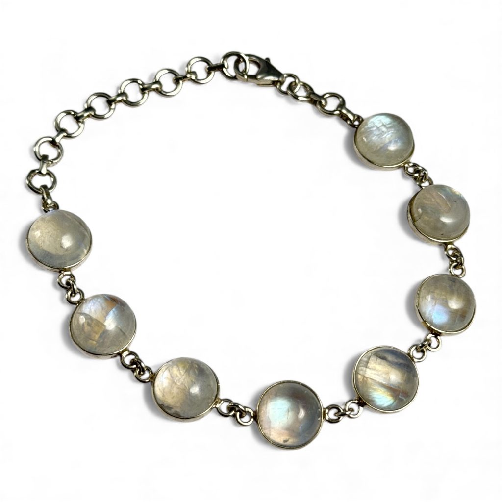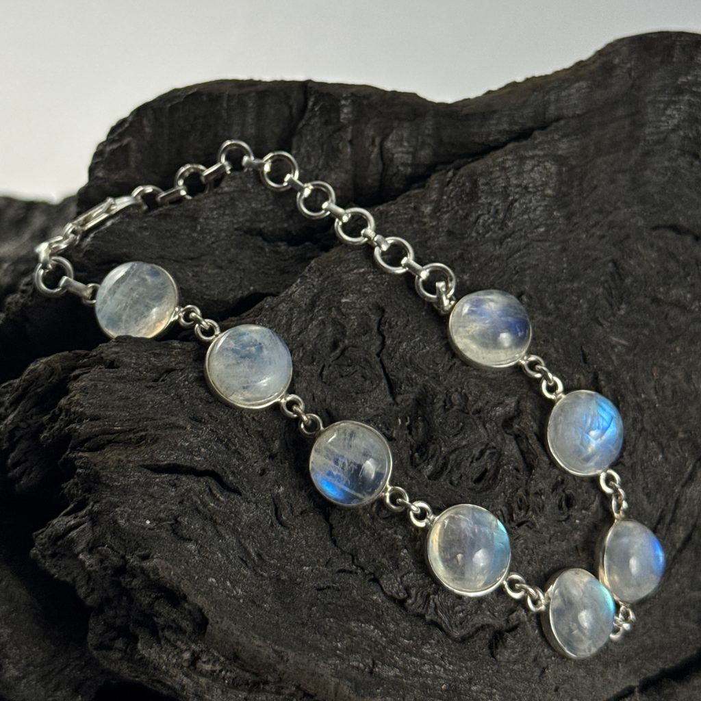 Tento elegantní náramek ze stříbra Ag 925 je zdoben osmi kulatými cabochony z duhového měsíčního kamene, známého pro svůj jemný modravý lesk zvaný adularet. Měsíční kámen je tradičně spojován s intuitivní energií, ochranou na cestách, ženskou silou a harmonií, často se používá při meditaci, k uklidnění emocí či posílení vnitřního klidu. Stříbrné propojení jednotlivých kamenů podtrhuje jeho jemnou, mystickou povahu.