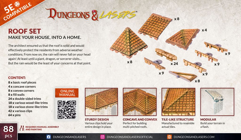Souprava Dungeons & Lasers: Roof Set obsahuje 88 plastových součástek, určených k sestavení střech. Celý systém je modulární a díky přiloženým spojovacím dílkům je tak možné kombinovat jej s dalšími produkty z řady budov Dungeons & Lasers podle individuální potřeby vaší hry!