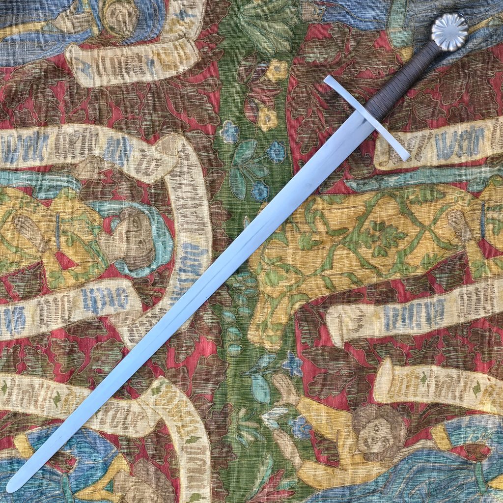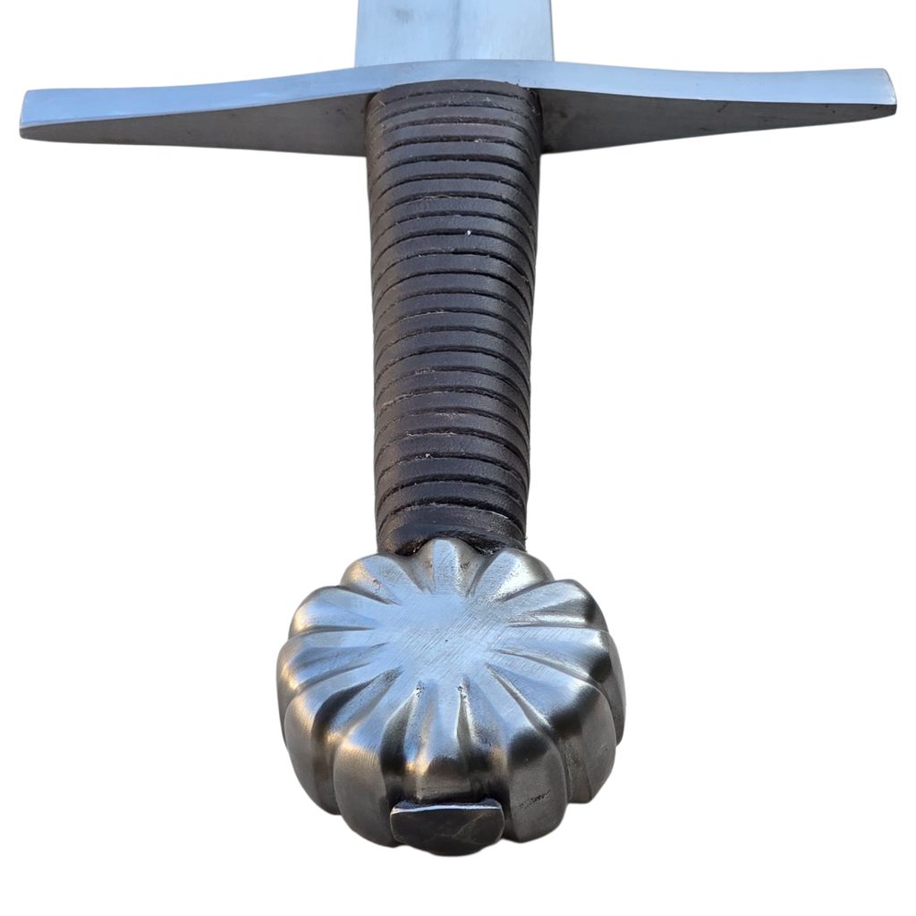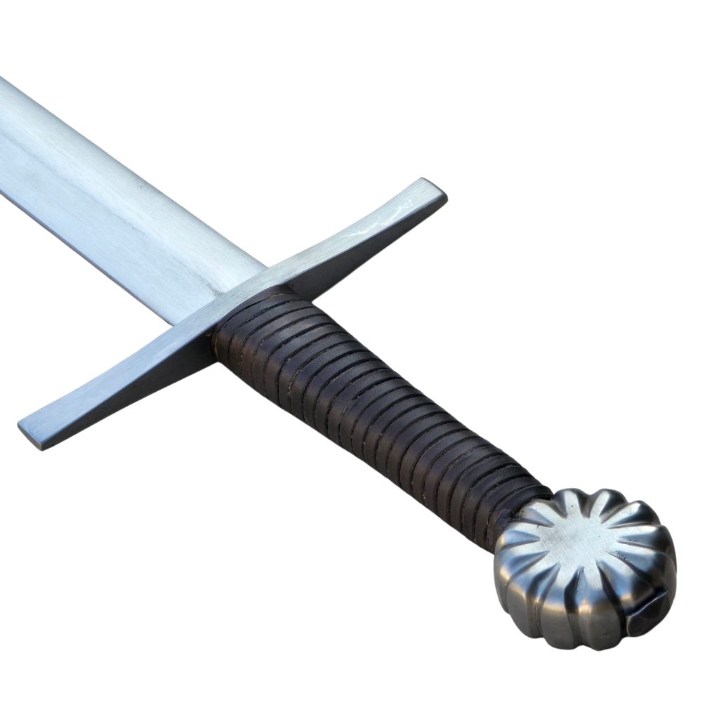 Jednoruční středověký meč z naší kovářské dílny. Konstrukčně i řemeslně velmi povedený meč v provedení full-tang. Celá čepel je vyrobena v jednom kuse, skrz hlavici meče, kde je čepel zanýtována. V tomto tupém provedení je meč určen ke scénickému šermu.