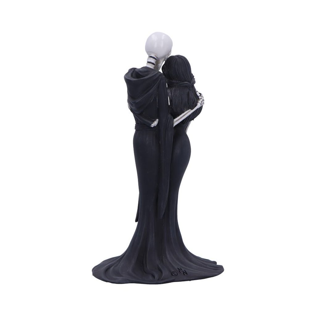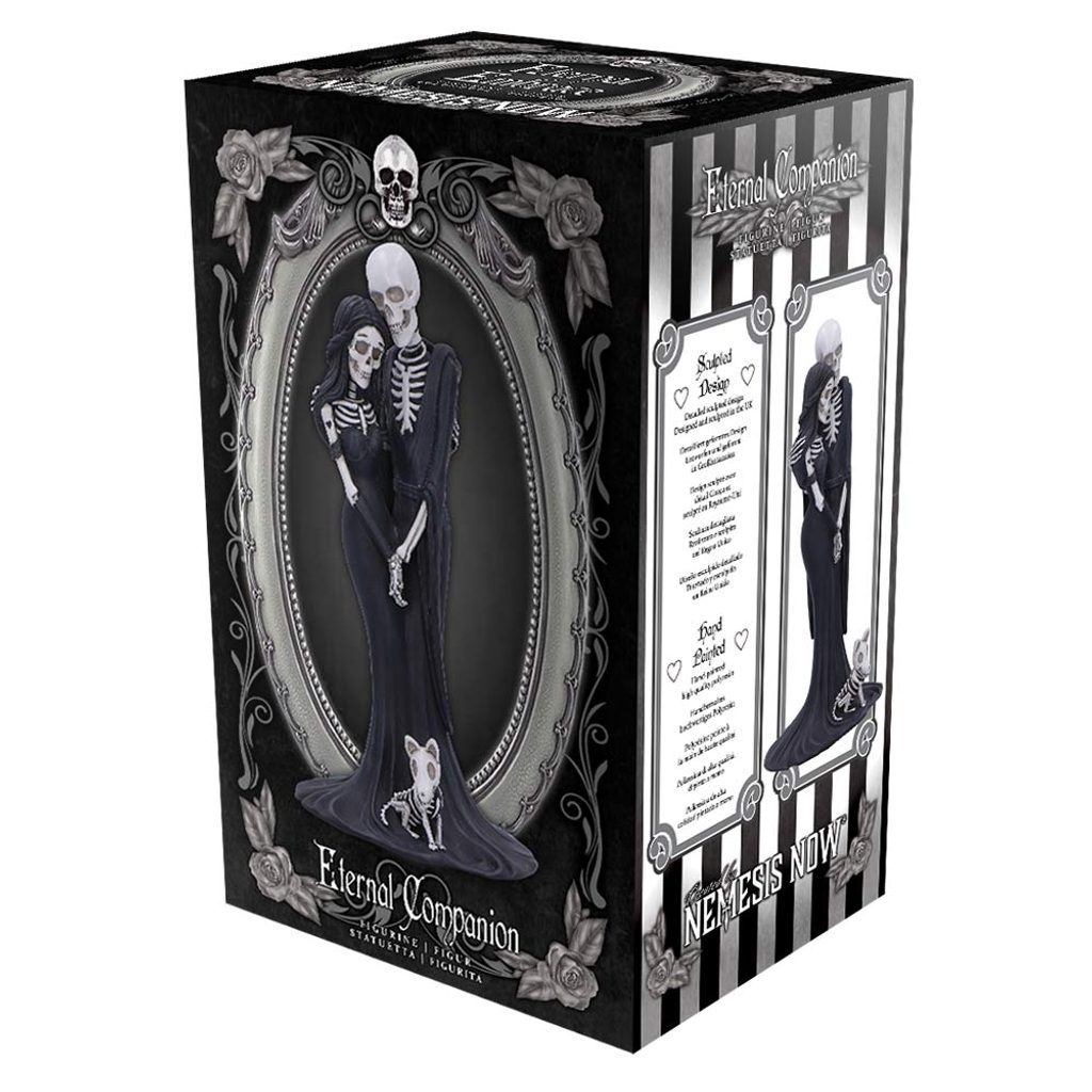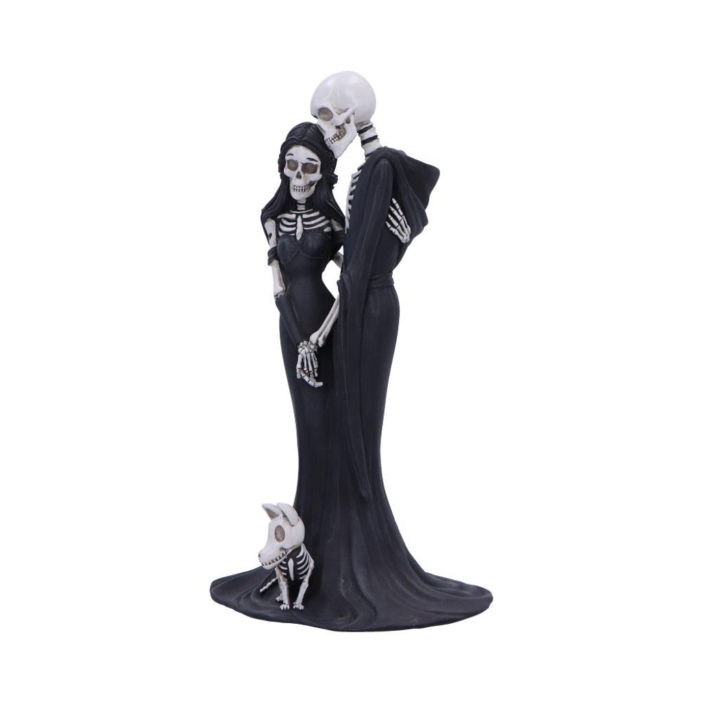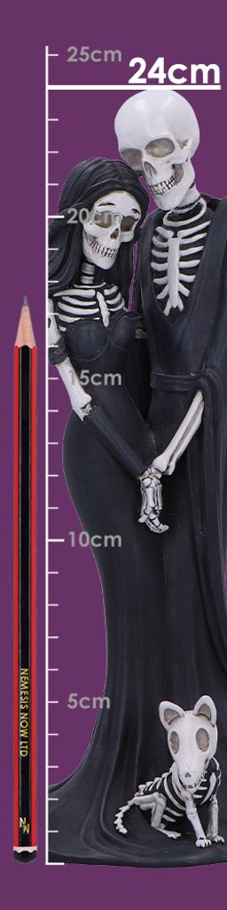 Dva kostlivci, objímající se v něžném sevření, připomínají, že skutečné pouto přetrvá i za hranicí života. Jejich věrný pes sedící u nohou podtrhuje motiv oddanosti a přátelství, které nikdy nekončí. Precizně vypracované detaily, od jemné kosterní struktury až po realistické ruční malování, dodávají dílu hloubku a charakter. Vyrobeno z odolného polyresinu, který zajišťuje dlouhou životnost a stabilitu.
