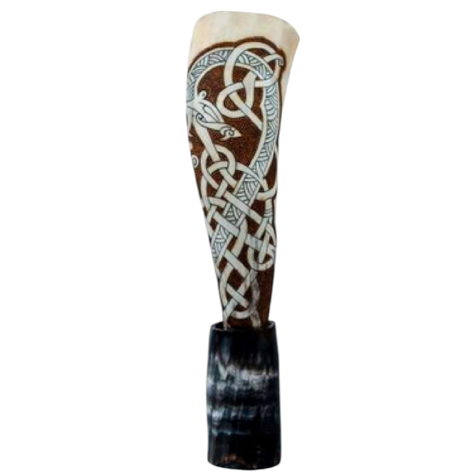 Špičkově řemeslně zpracovaný a do nejmenšího detailu vyrytý vikingský roh z rohoviny. Objevují se různé severské ornamenty a symboly.