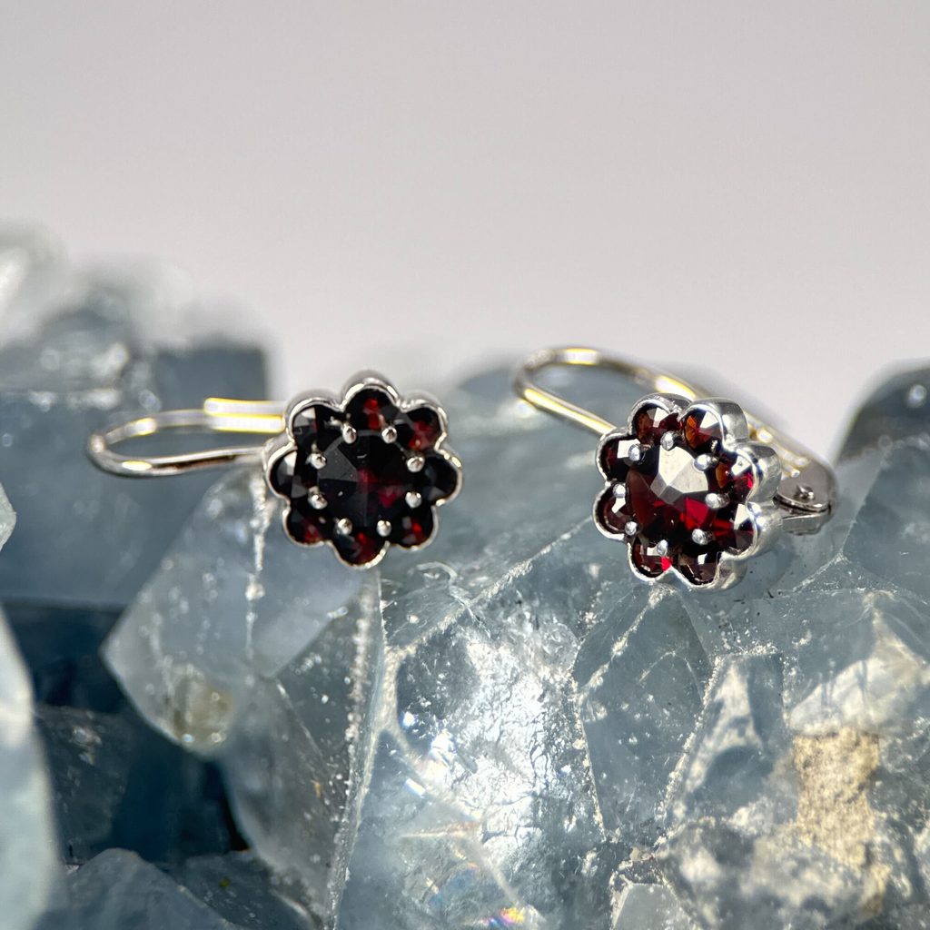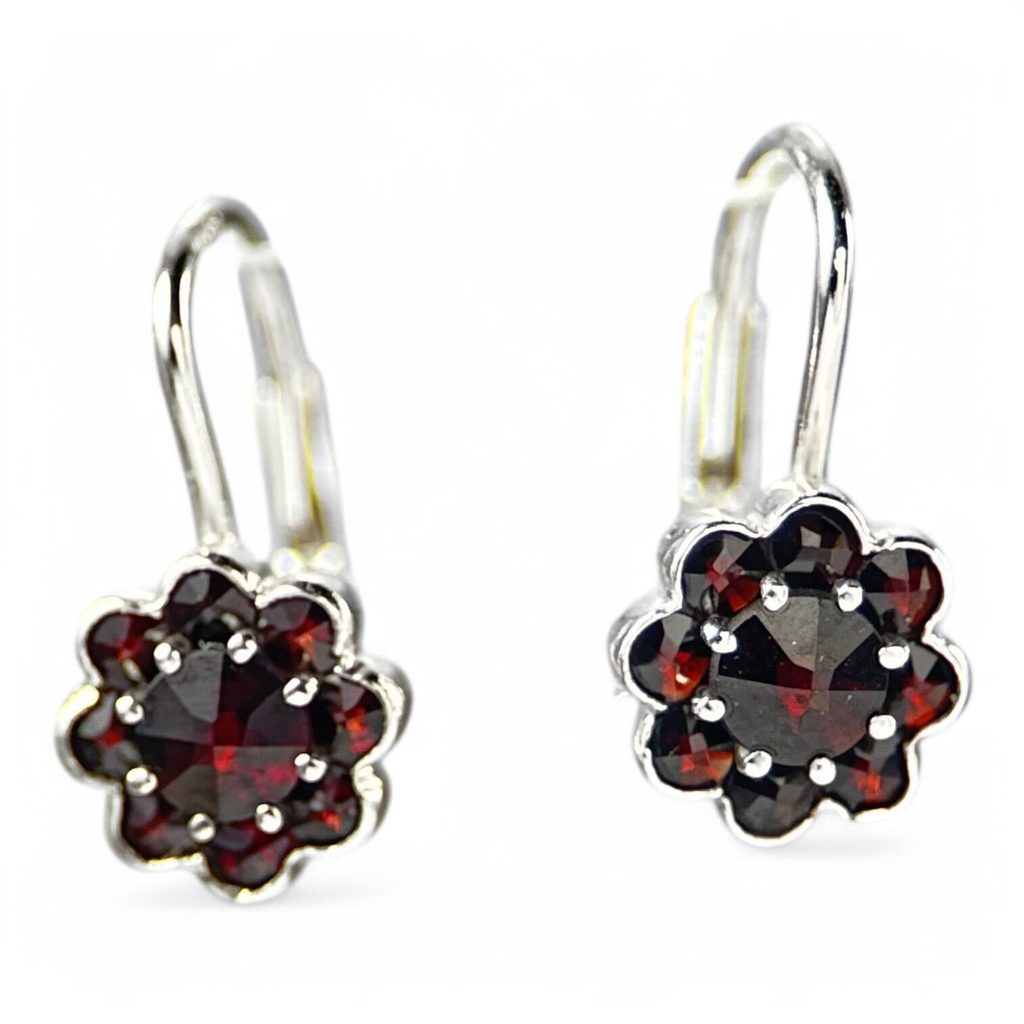 Stříbrné náušnice s jemnými granáty ve tvaru květiny. Náušnice se vyrábí ručně v dílně v Turnově, v centru šperkařství v České republice.