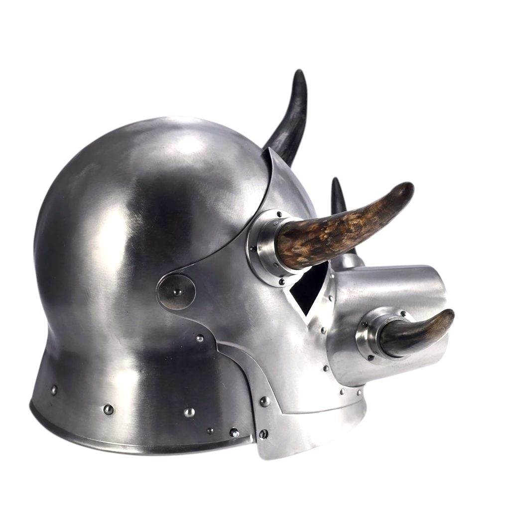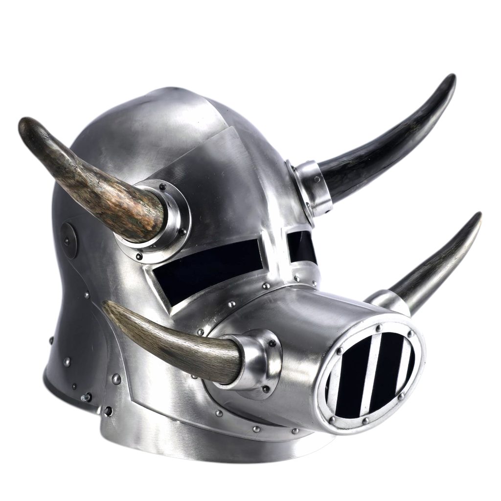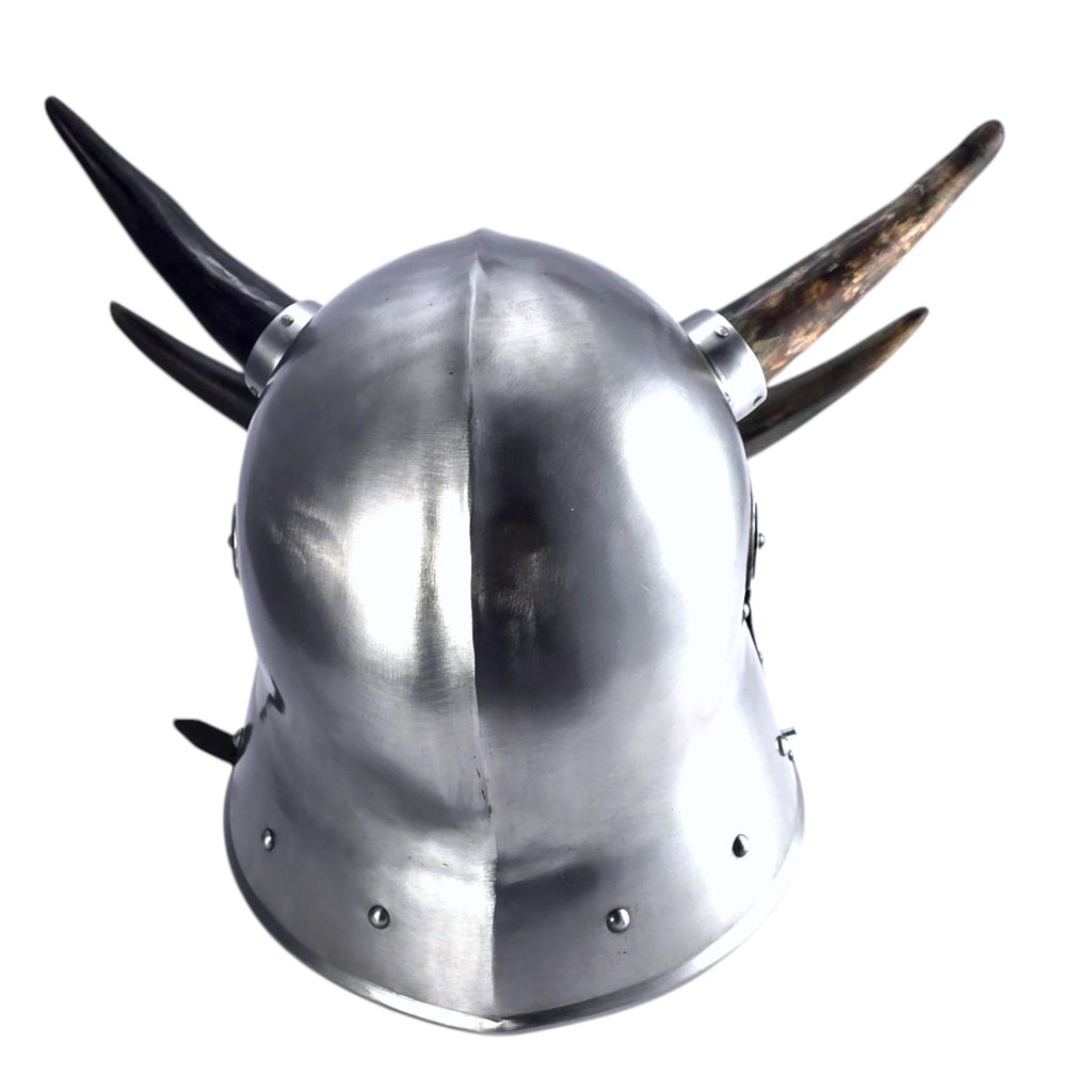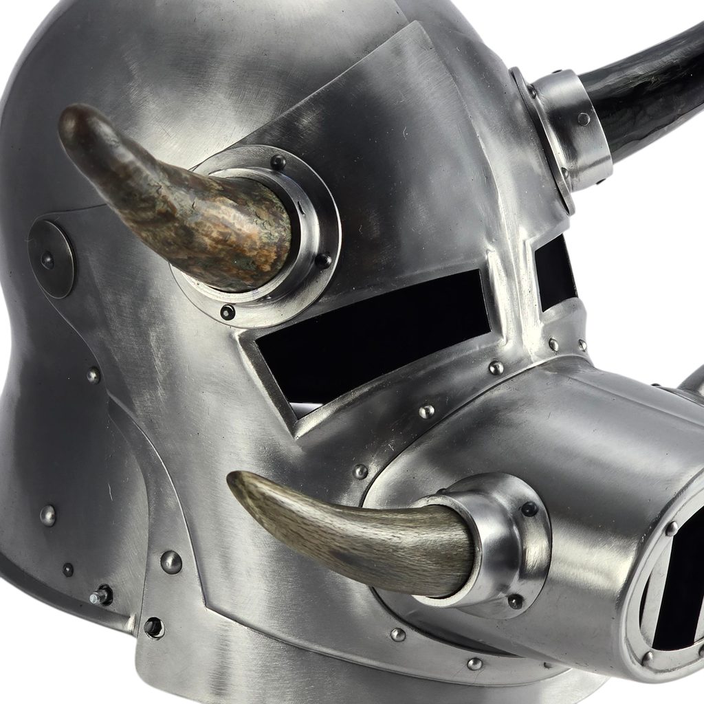Volná reprodukce gladiátorské přilby s kravskými rohy ve fantasy stylu.