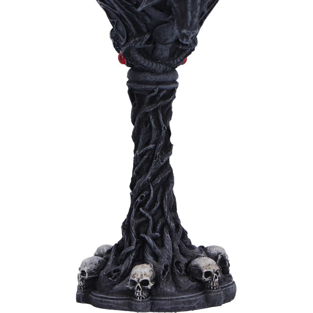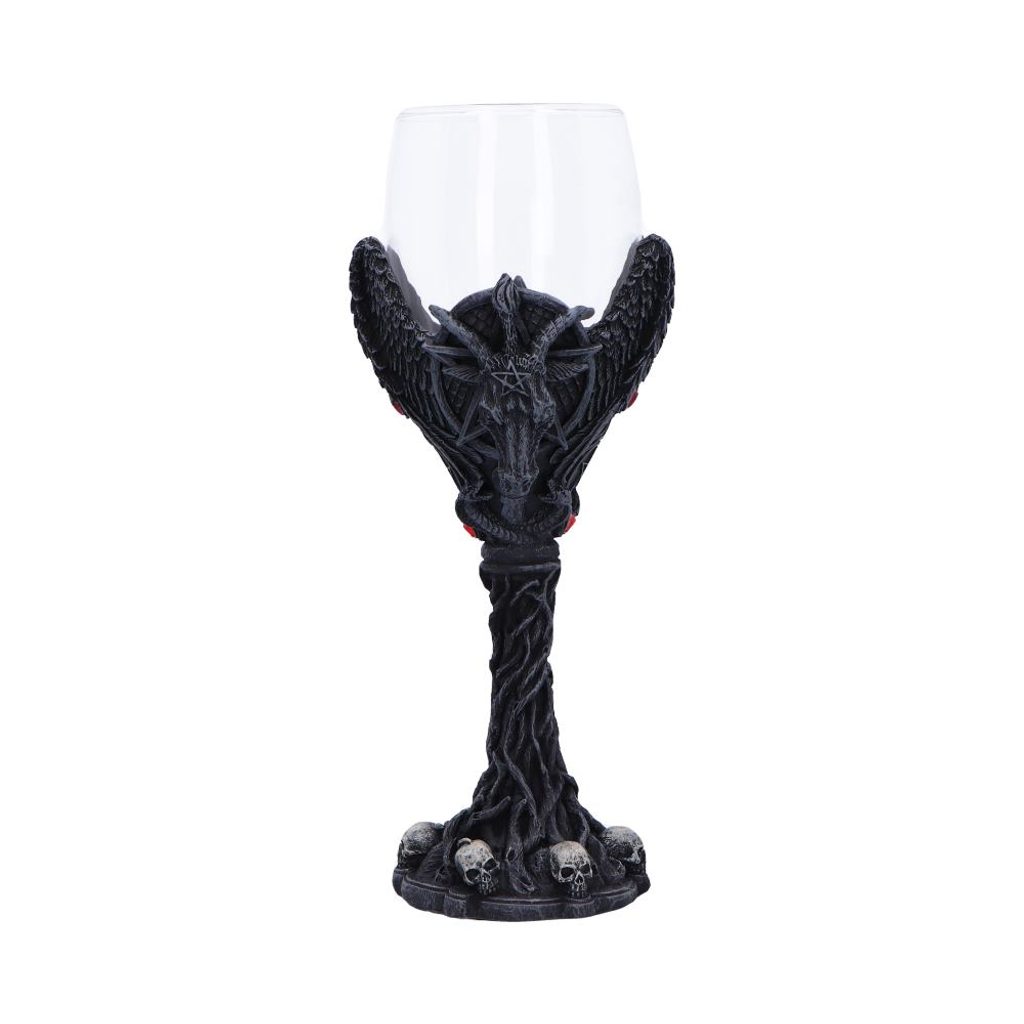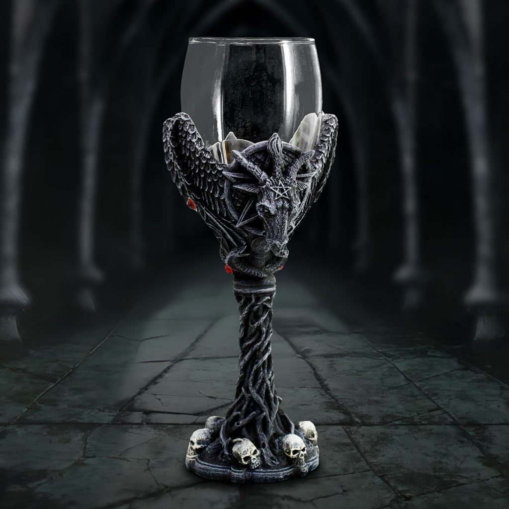 Tento kalich je temným a symbolickým dílem v gotickém stylu, navrženým pro milovníky okultních motivů a výrazné dekorace. Vyrábí se z odolné pryskyřice s matným černým povrchem a zdobí ho detailní plastika hlavy Baphometa na pozadí vyvýšeného pentagramu. Okolo základny jsou reliéfy lebek, které umění dodávají dramatický nádech.