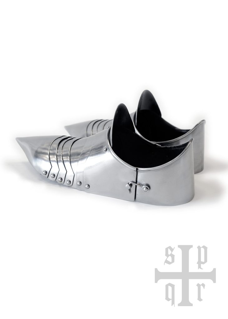 Tyto nositelné kloubové sabatony vycházejí z předloh ze 14. století. Jsou ručně kované z oceli o tloušťce 1,5 mm, z vnitřní strany černěné pro lepší ochranu proti korozi a na spodní straně opatřené nýtovanými koženými řemínky. Nemají podrážku a skládají se ze zúžené špičaté špičky, několika kloubově spojených pásů (lamel), kotníkové desky, „jazykové“ desky a patní krytky, přičemž všechny části jsou spojeny pevnými nýty.