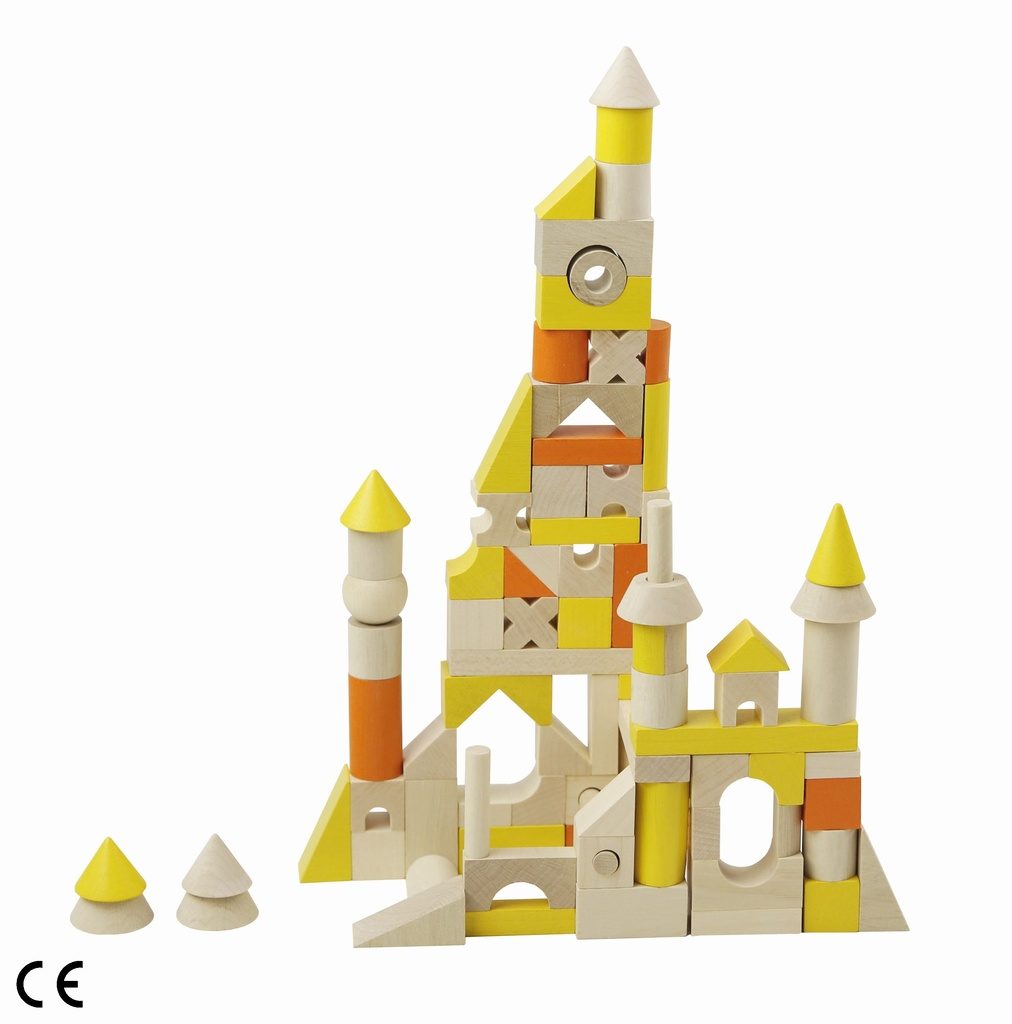 Stavebnice obsahuje 96 dřevěných dílků v různých tvarech a velikostech.