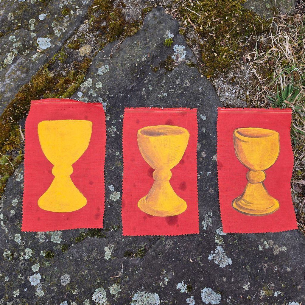 Husitská vlajka je šitá ze dvou vrstev lehčího červeného lněného plátna s ručně malovaným motivem. Malba přímo na plátno je pružná, fixovaná a trvanlivá.