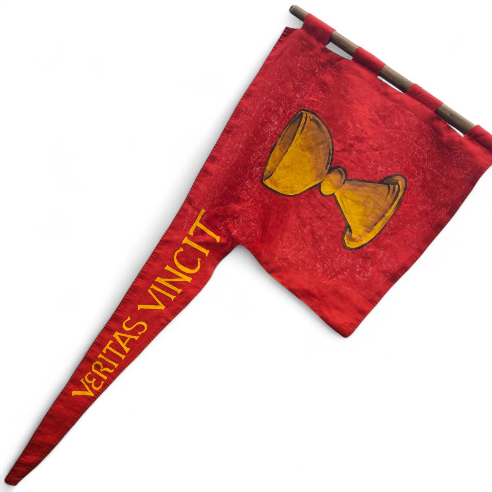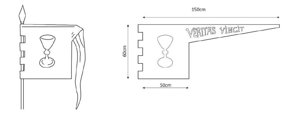Motiv: žlutý/zlatý kalich na červeném pozadí na obou stranách, nápis „veritas vincit“ na volném cípu zástavy. Na okraji jsou 4 úchyty na žerď a nahoře tunel pro příčnou tyč.