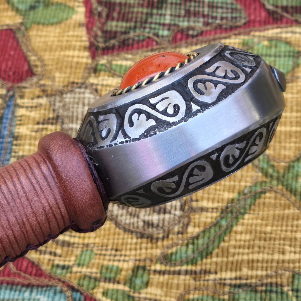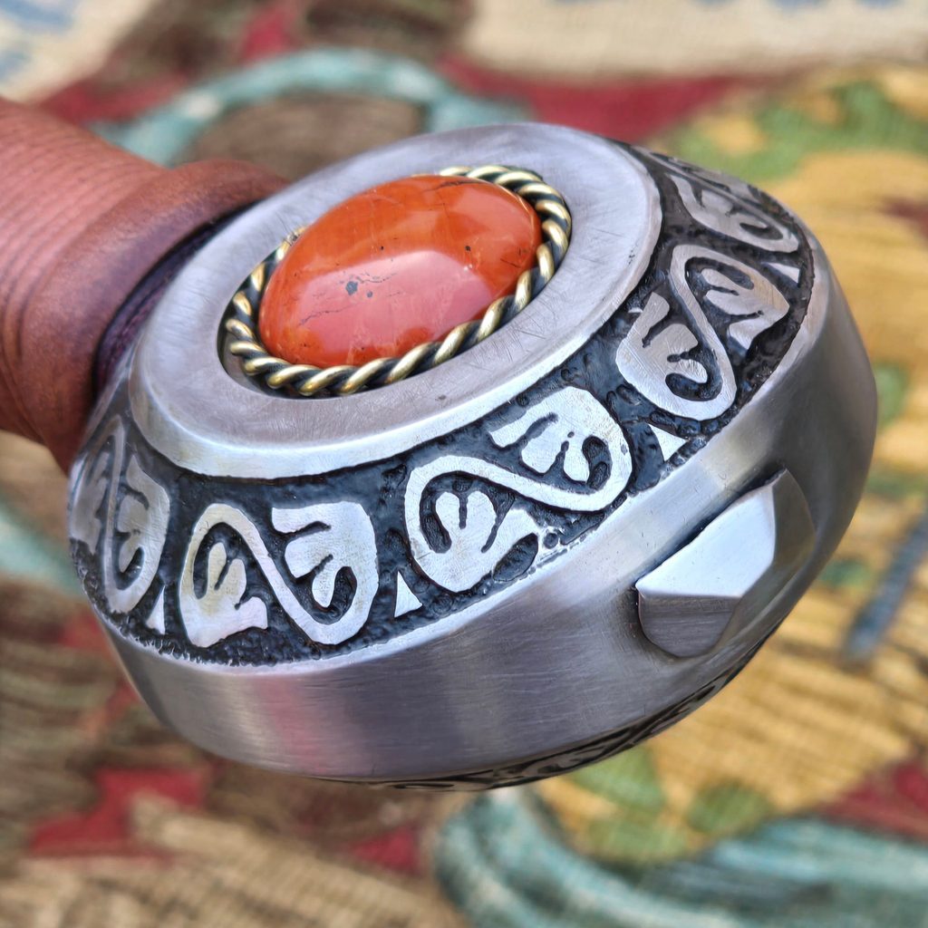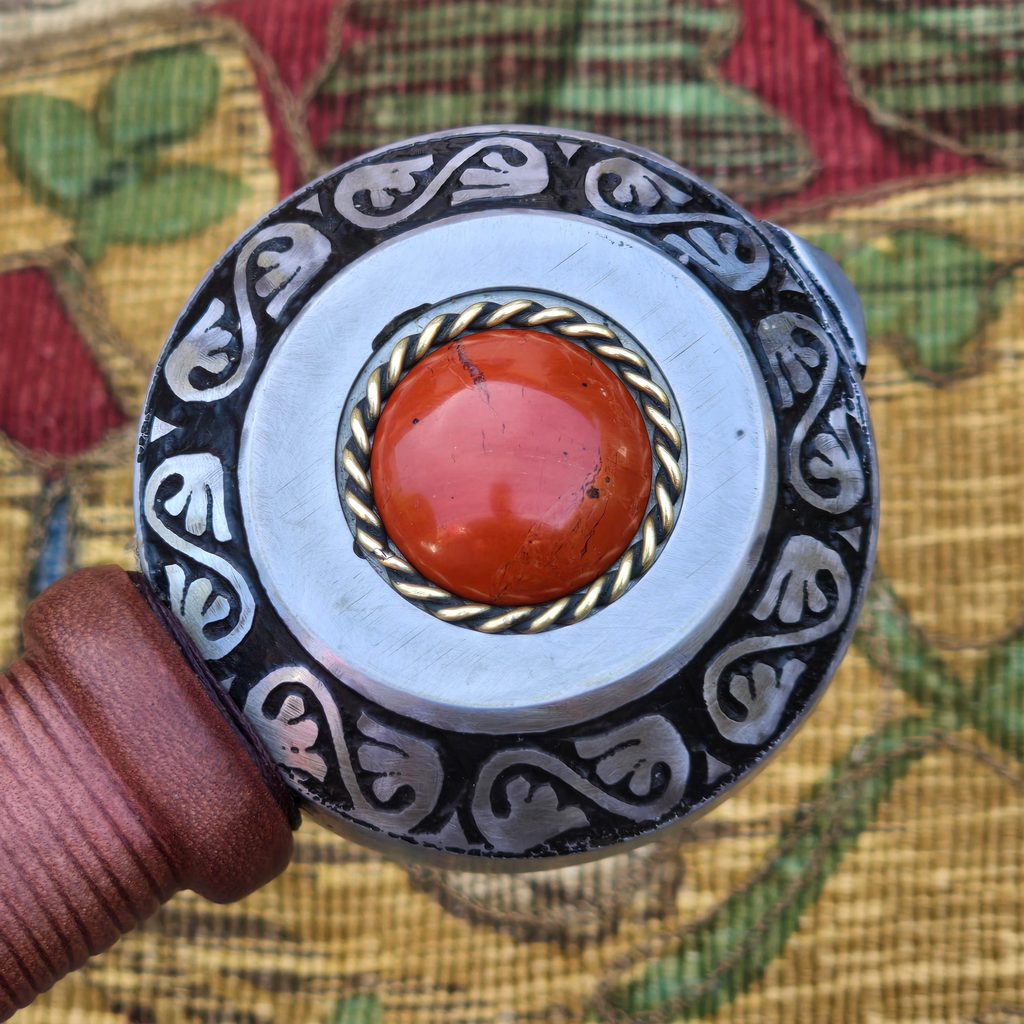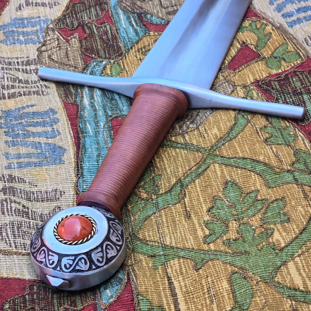 Jednoruční středověký meč z naší kovářské dílny. Konstrukčně i řemeslně velmi povedený meč v provedení full-tang. Celá čepel je vyrobena v jednom kuse, skrz hlavici meče, kde je čepel zanýtována. V tomto tupém provedení je meč určen ke scénickému šermu.