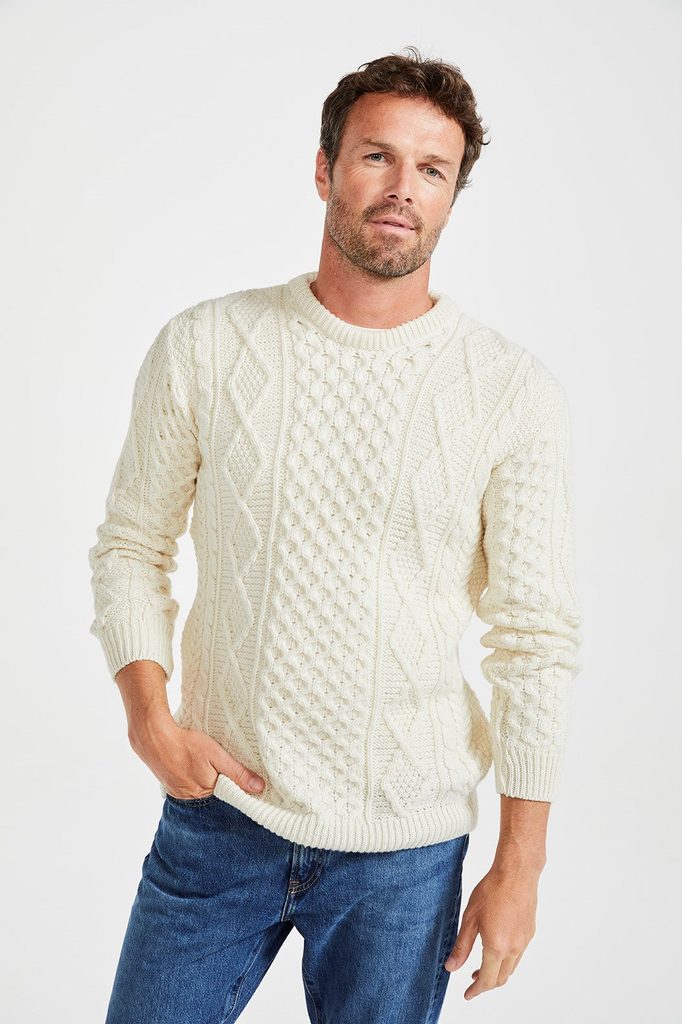 Unisex tradiční irský svetr s kulatým výstřihem z naší supersoft merino vlny, navržený podle střihu pro pánské oblečení, ale skvěle padne jak mužům, tak ženám. Uprostřed má vzor včelí plástve, po stranách doplněný diamantovým stehem, poté copánkovým vzorem a nakonec mechovým stehem na bocích pro hladké zakončení. Výstřih, manžety a lem jsou žebrované. Tento univerzální kousek je základ každého šatníku – pro ženy vypadá skvěle s boyfriend džíny a kotníkovými botami; pro muže se hodí k džínům nebo chinos kalhotám, s botami nebo polobotkami, podle toho, zda preferujete ležérní nebo formálnější vzhled.