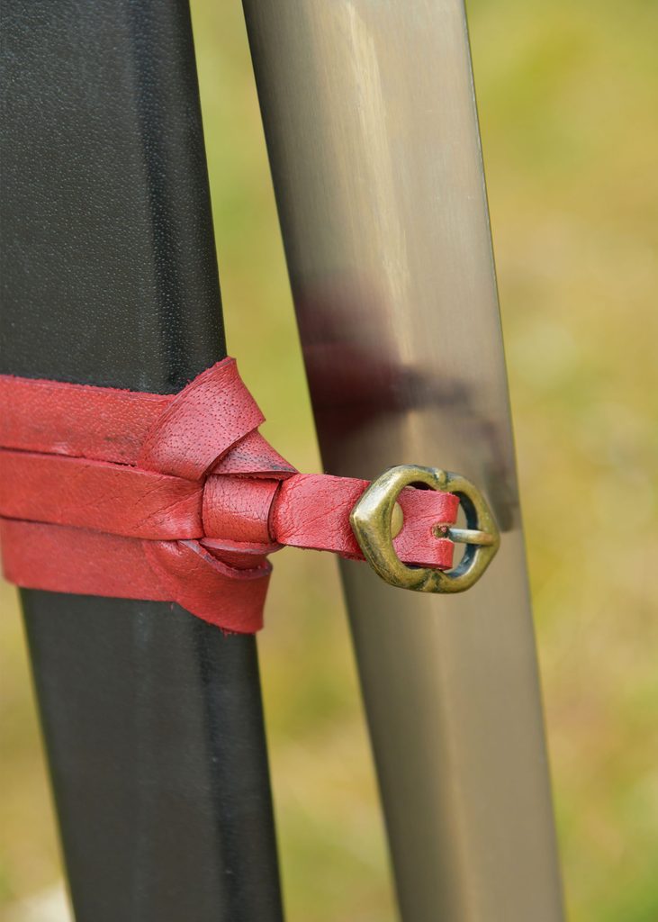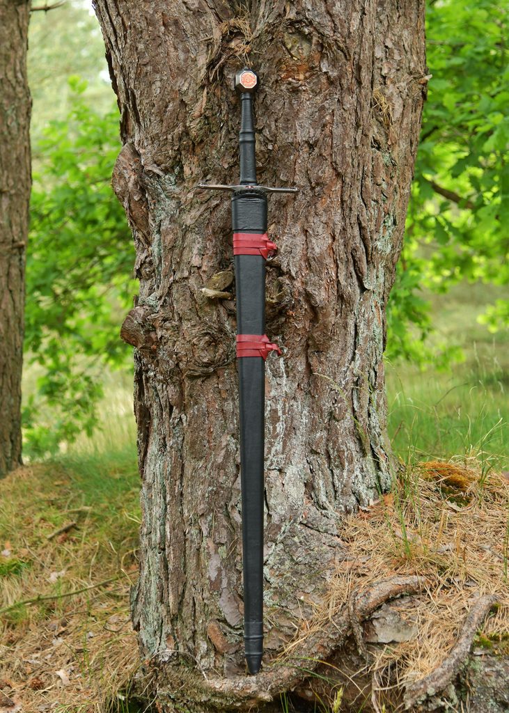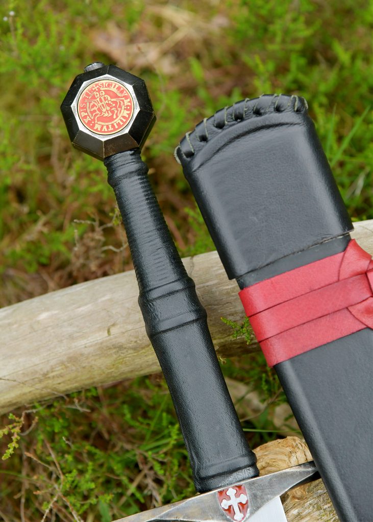 Meč je dodáván se dřevěnou pochvou potaženou černou kůží. Dva červené kožené řemínky s mosaznými přezkami ve starožitném stylu nejen esteticky doplňují vzhled, ale také umožňují snadné připevnění k opasku na meč.