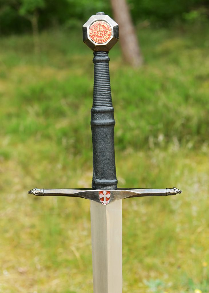 Tento obouruční meč má dřevěnou rukojeť potaženou černou kůží, která zajišťuje pohodlný a pevný úchop. Záštita i hlavice jsou ocelové s patinovaným (starožitným) povrchem. Přímá záštita je zakončena stylizovanými vlčími hlavami a uprostřed ji zdobí stříbrný templářský kříž na červeném smaltovaném podkladu.