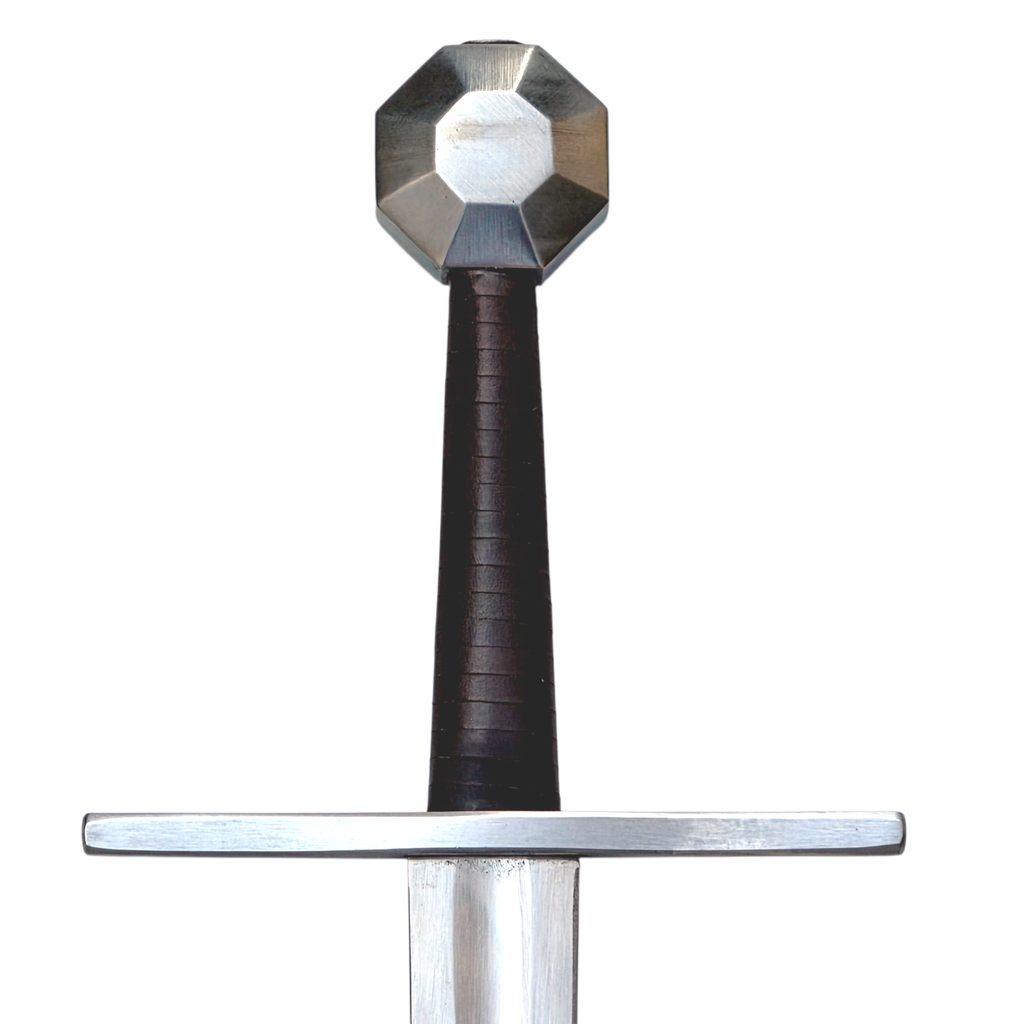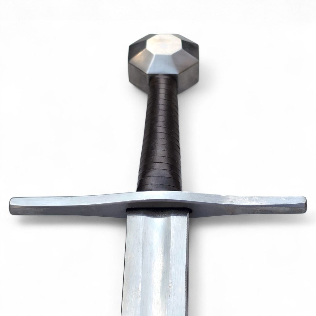 Jednoruční středověký meč z naší kovářské dílny. Konstrukčně i řemeslně velmi povedený meč v provedení full-tang. Celá čepel je vyrobena v jednom kuse, skrz hlavici meče, kde je čepel zanýtována. V tomto tupém provedení je meč určen ke scénickému šermu.