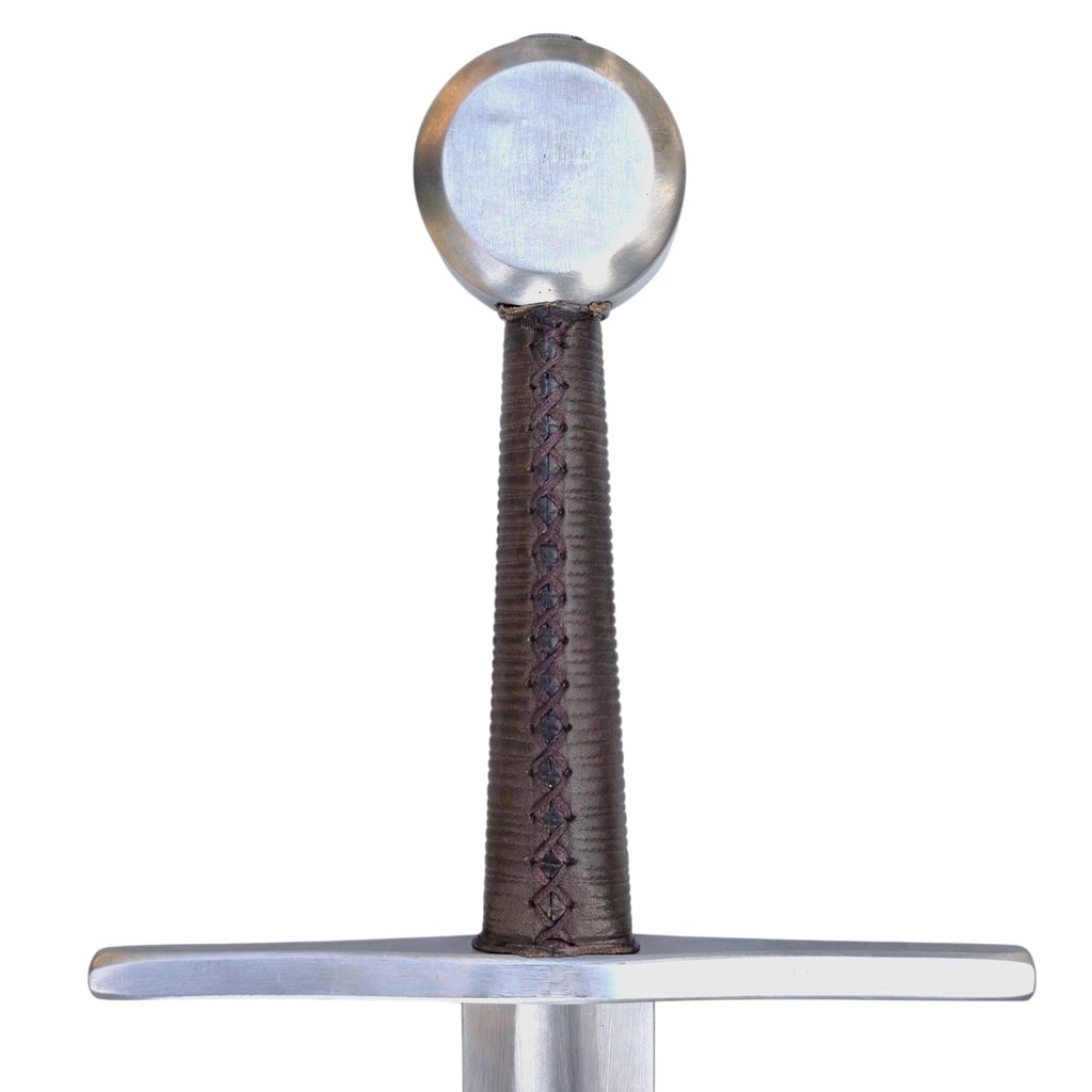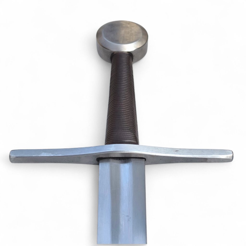 Jednoruční středověký meč z naší kovářské dílny. Konstrukčně i řemeslně velmi povedený meč v provedení full-tang. Celá čepel je vyrobena v jednom kuse, skrz hlavici meče, kde je čepel zanýtována. V tomto tupém provedení je meč určen ke scénickému šermu.