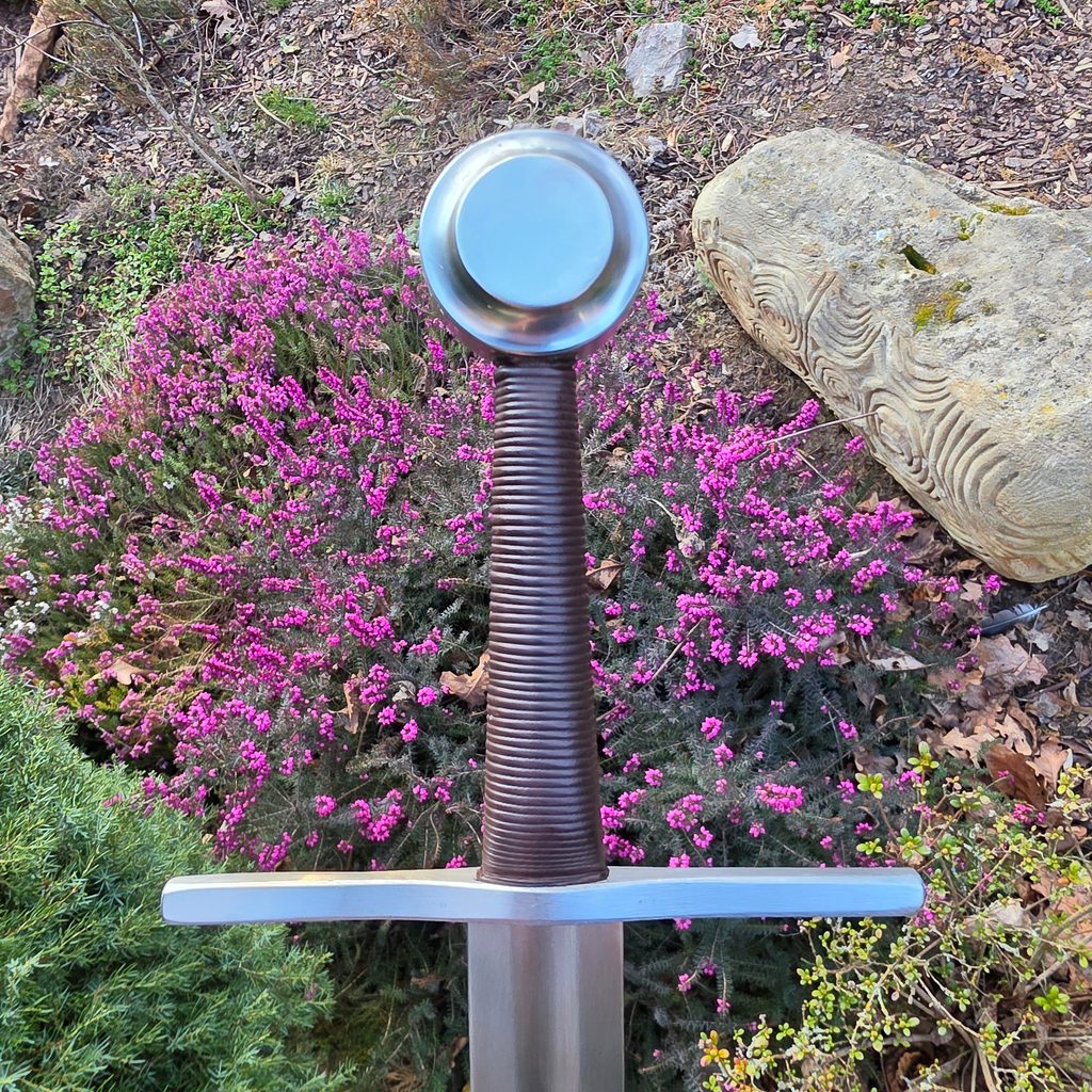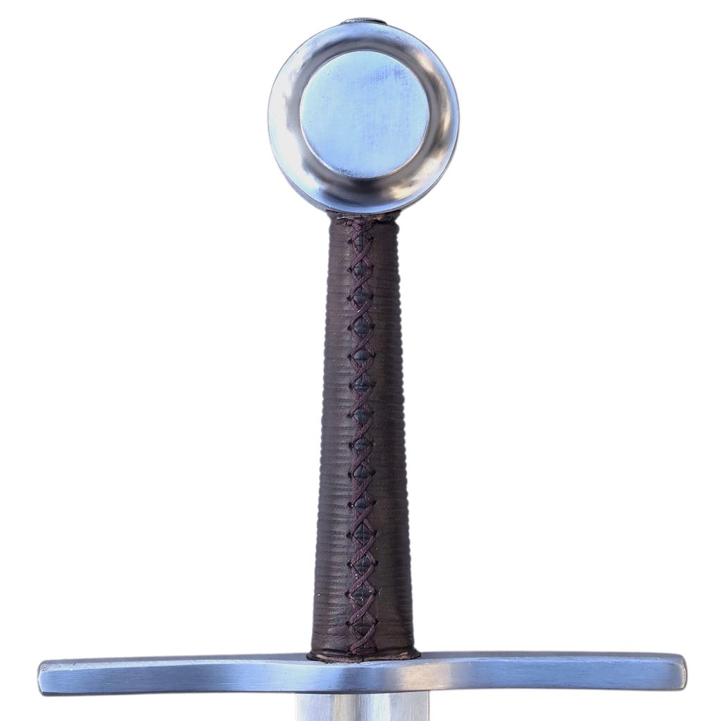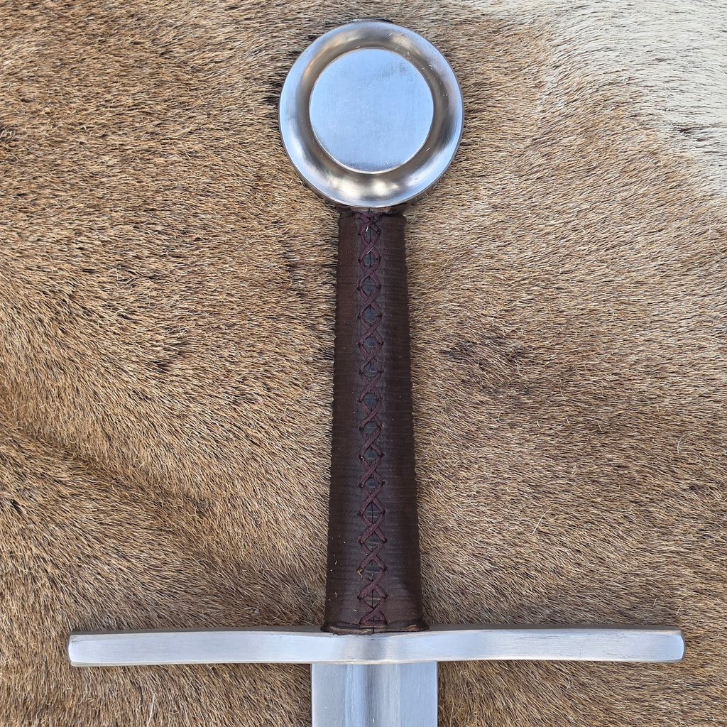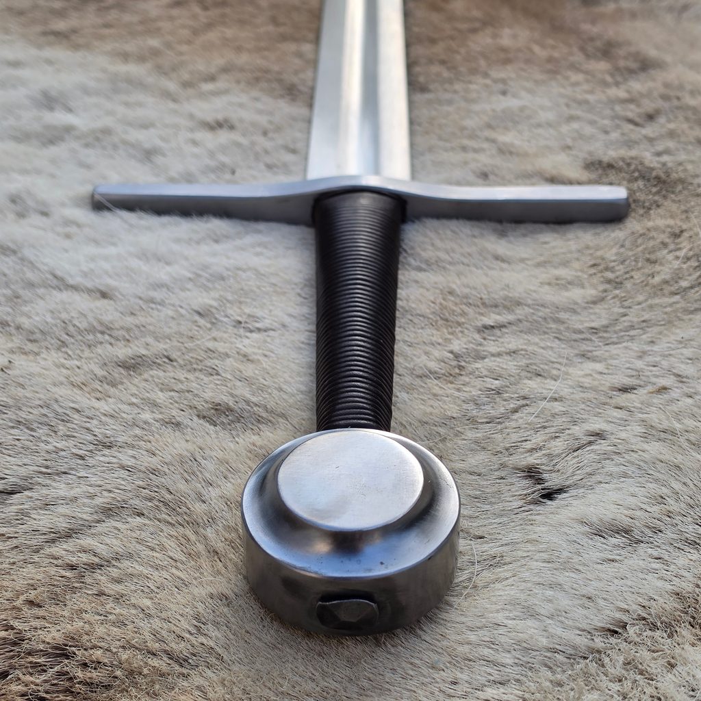 Jednoruční středověký meč z naší kovářské dílny. Konstrukčně i řemeslně velmi povedený meč v provedení full-tang. Celá čepel je vyrobena v jednom kuse, skrz hlavici meče, kde je čepel zanýtována. V tomto tupém provedení je meč určen ke scénickému šermu.