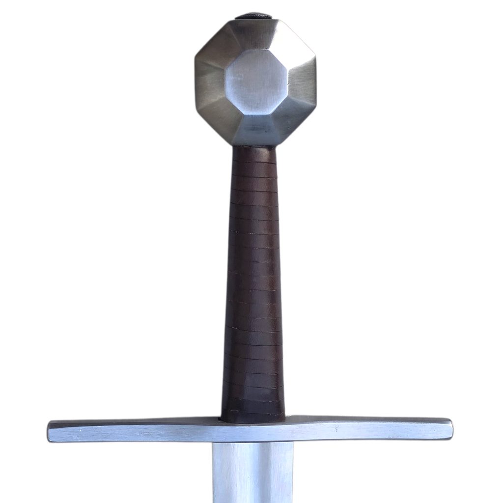 Jednoruční středověký meč z naší kovářské dílny. Konstrukčně i řemeslně velmi povedený meč v provedení full-tang. Celá čepel je vyrobena v jednom kuse, skrz hlavici meče, kde je čepel zanýtována. V tomto tupém provedení je meč určen ke scénickému šermu.