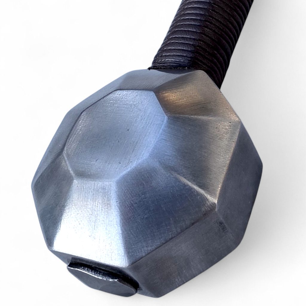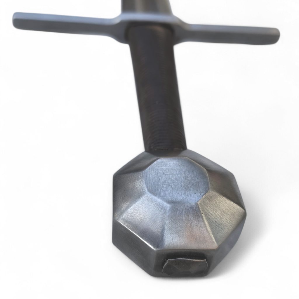 Jednoruční středověký meč z naší kovářské dílny. Konstrukčně i řemeslně velmi povedený meč v provedení full-tang. Celá čepel je vyrobena v jednom kuse, skrz hlavici meče, kde je čepel zanýtována. V tomto tupém provedení je meč určen ke scénickému šermu.