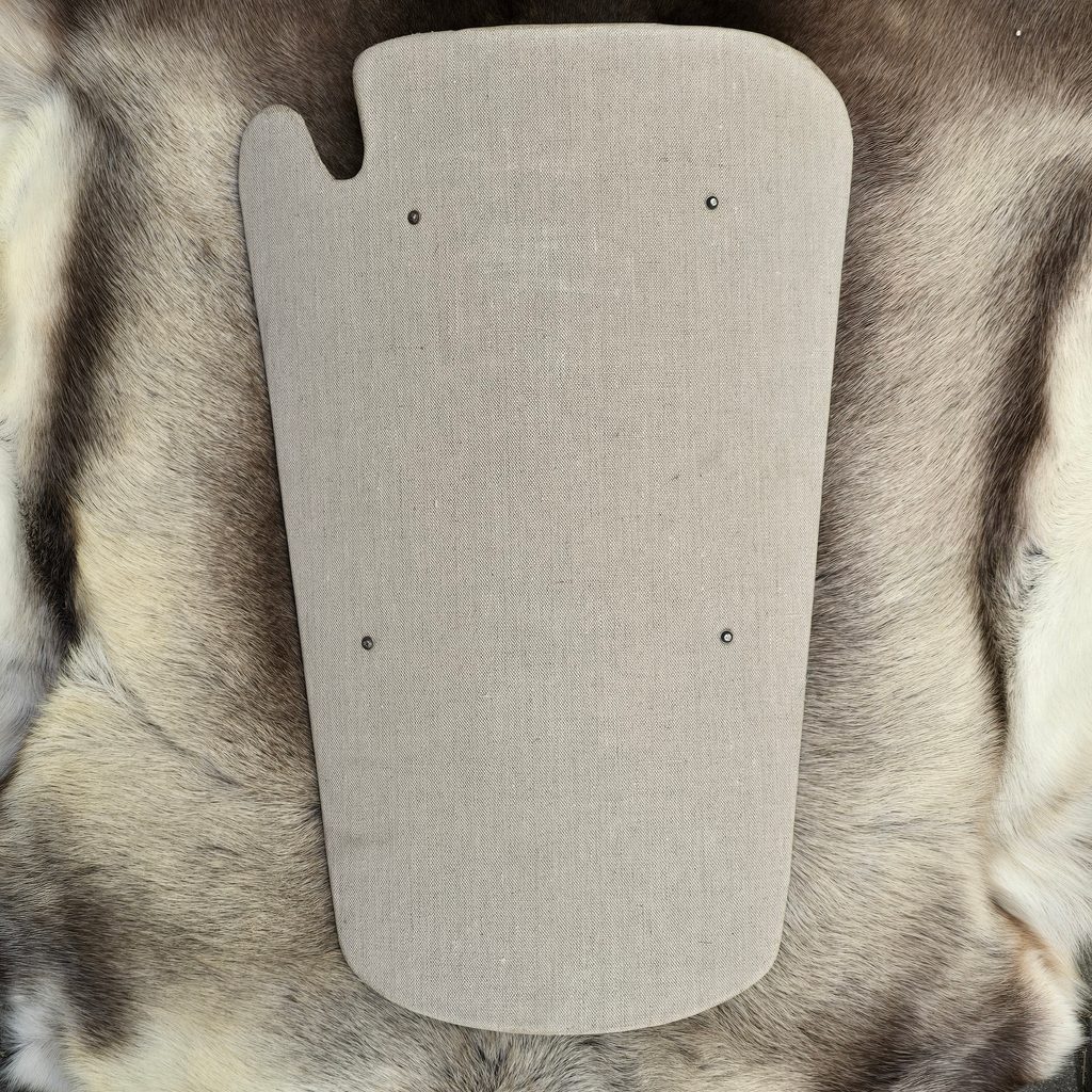 Dřevěný středověký štít - tzv. jezdecká tarče s výkusem pro kopí.