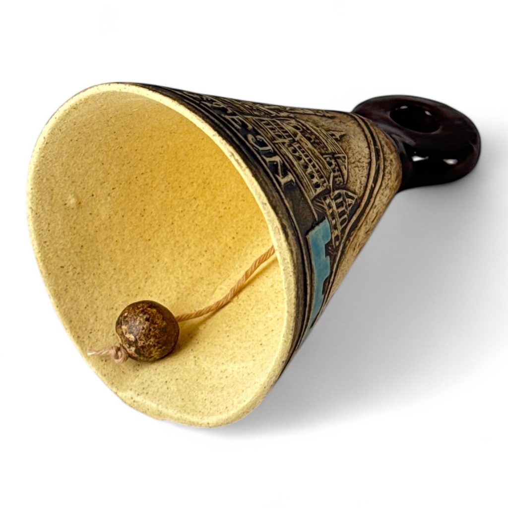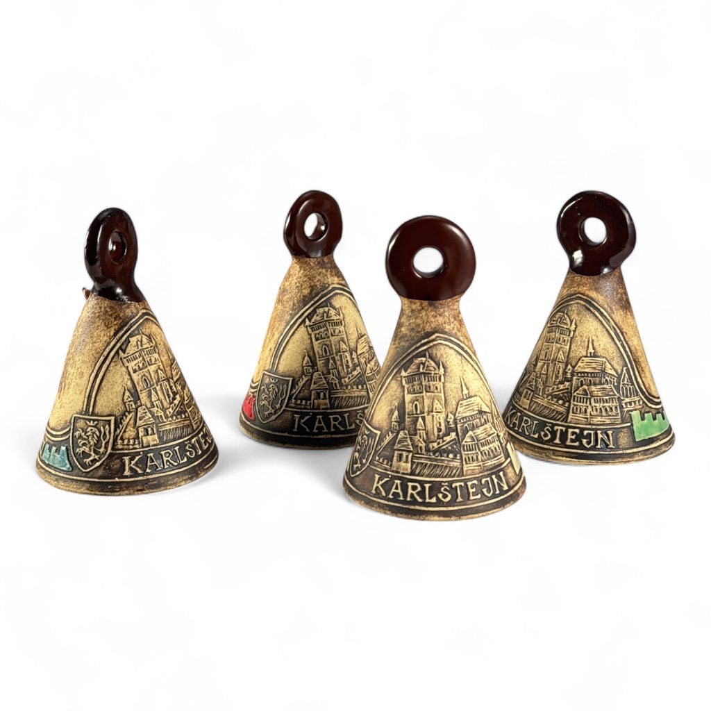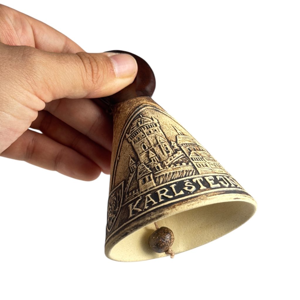 Keramický zvonek s vyobrazením města Karlštejn.