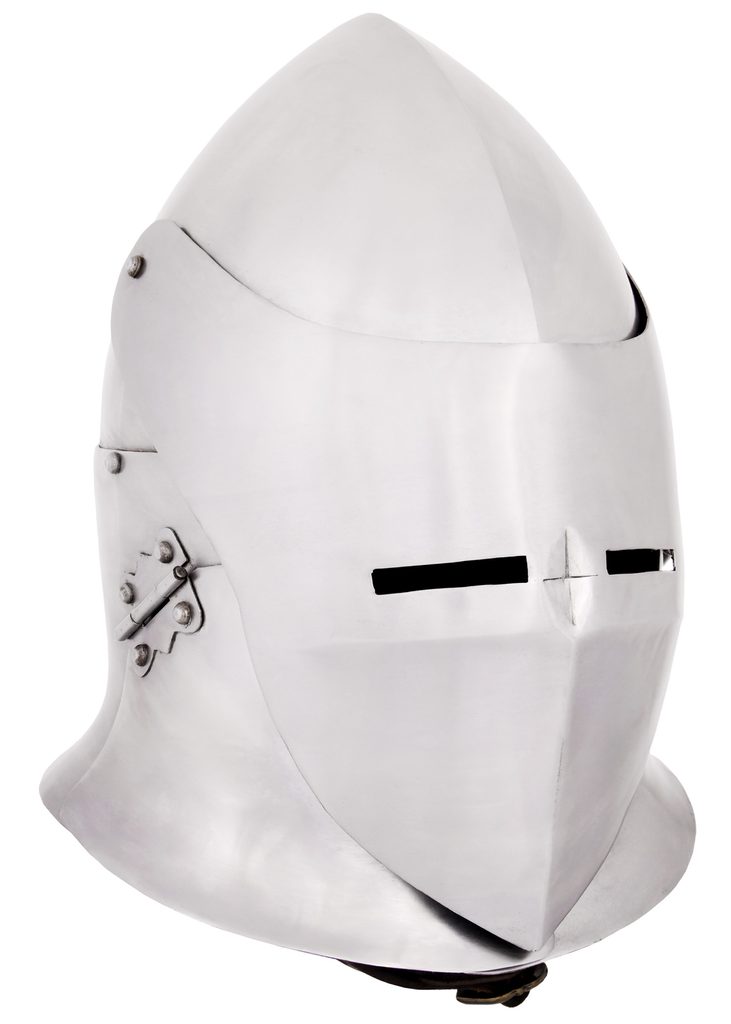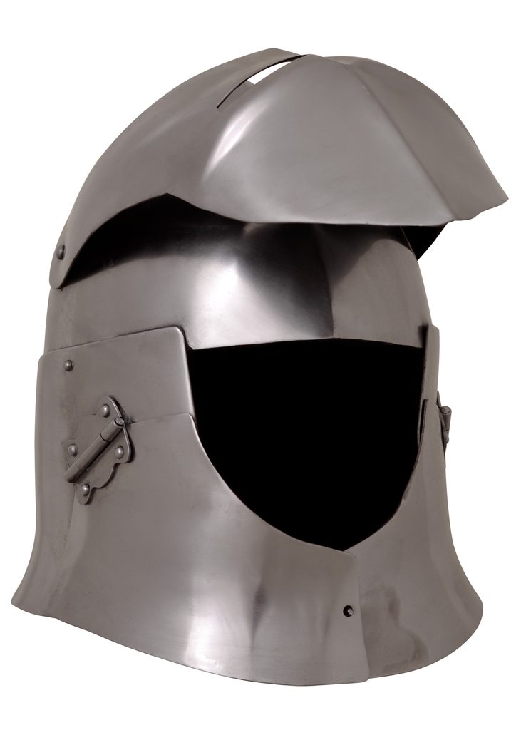 Tato středověká velká přilba představuje variantu známé přilby typu „Sugar Loaf“ (cukrová homole). Je ručně vyrobena z oceli o tloušťce cca 1,6 mm a je vybavena sklopným hledím. Pro maximální pohodlí při nošení je opatřena nastavitelnou koženou výstelkou a řemínkem pod bradu.