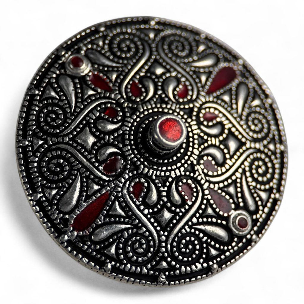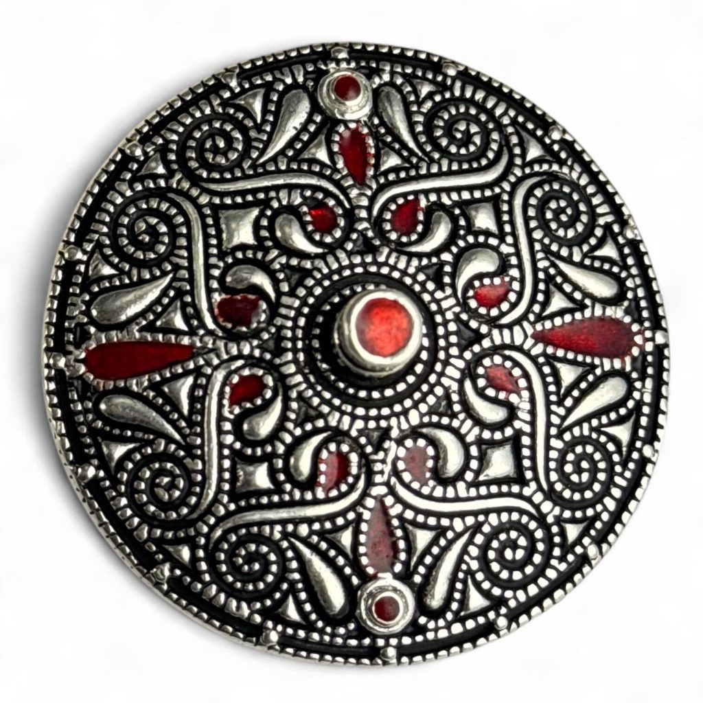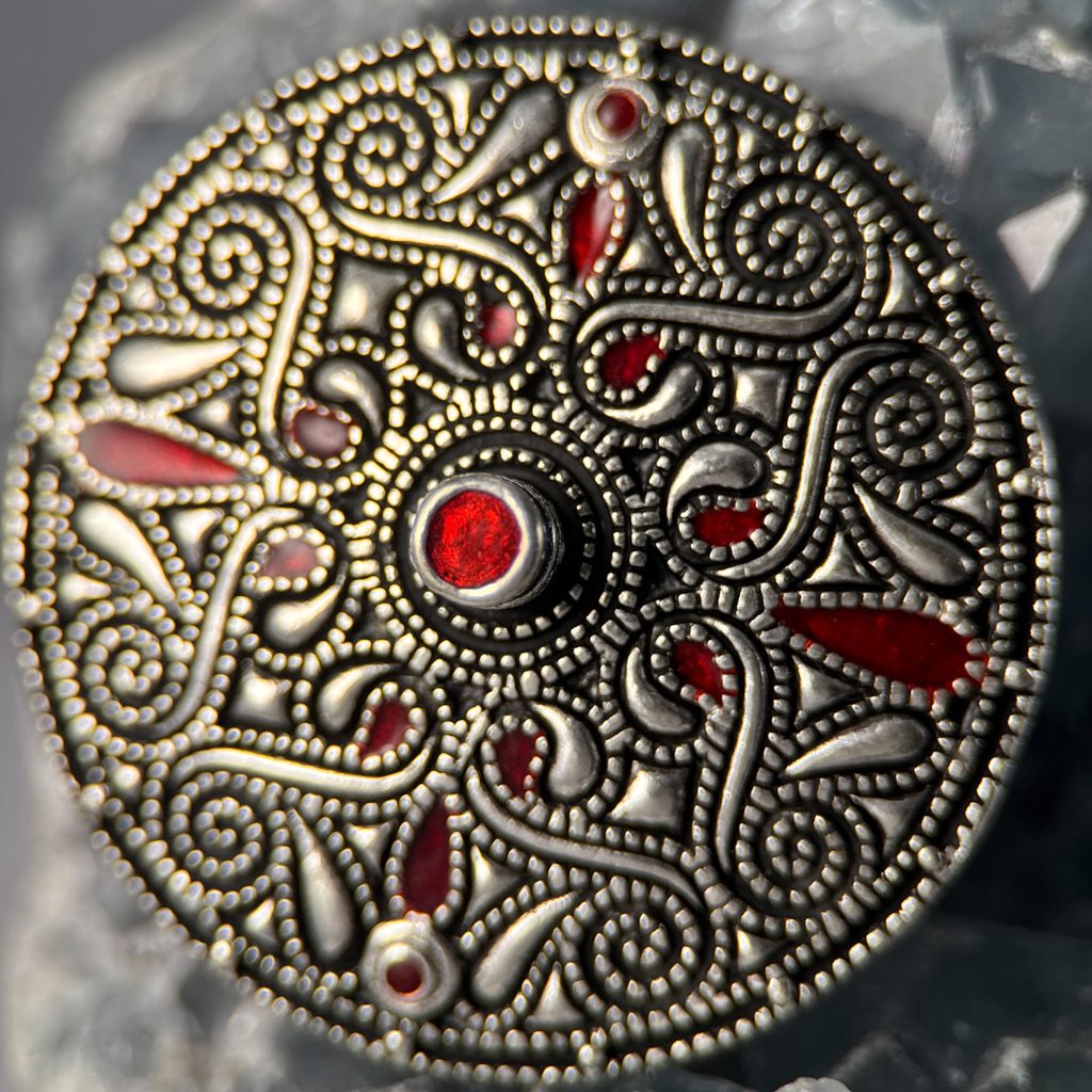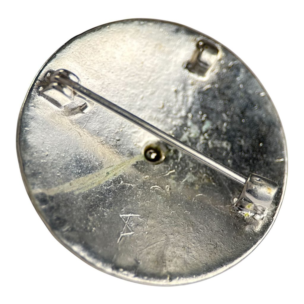 Brož měří v průměru 5 cm a je vyrobena z vysoce kvalitního litého postříbřeného bronzu s červenými smaltovanými vložkami.