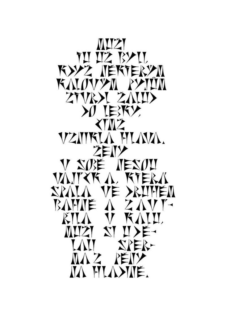 Kniha je ručně sázená originálním trnovým písmem na silný, v čase stabilní švédský papír barvy čerstvé mamutoviny. Text plní i úlohu ilustrací. Jde o ucelený rozvážený koncept, jehož nedílnou součástí jsou také čísla stran, tiráž a ISBN.